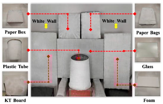 Various objects, including paper boxes, paper bags, plastic drums, glass, foam, and KT boards, as well as other items with diverse shapes and textures, are utilized to create a complex test environment in the industrial logistics scenario, as shown in Figure 19 (Yellow marks indicate the white wall positions). Under normal, dim, and no-light conditions, the measurement system developed in this study is used to collect images, and the proposed method is employed for feature extraction and reconstruction.