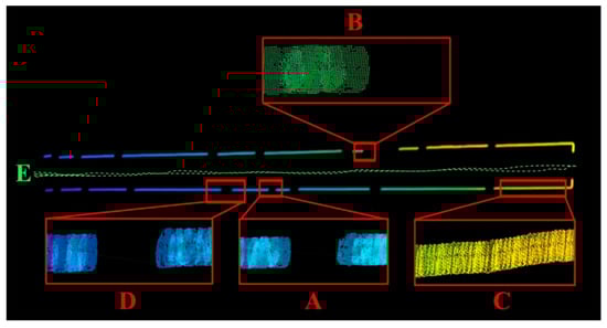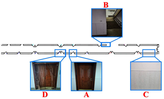 To validate the effectiveness of the proposed approach for mobile environment modeling in weak-texture scenarios, a typical narrow corridor with a depth of 50 m and a width of 2 m was selected as the experimental site. The experimental environment is illustrated in Figure 21, comprising four local areas labeled A, B, C, and D. As shown in Figure 22, area A corresponds to a narrow doorway, area B to a staircase corner, area C to a corridor plane, and area D to a wide doorway.