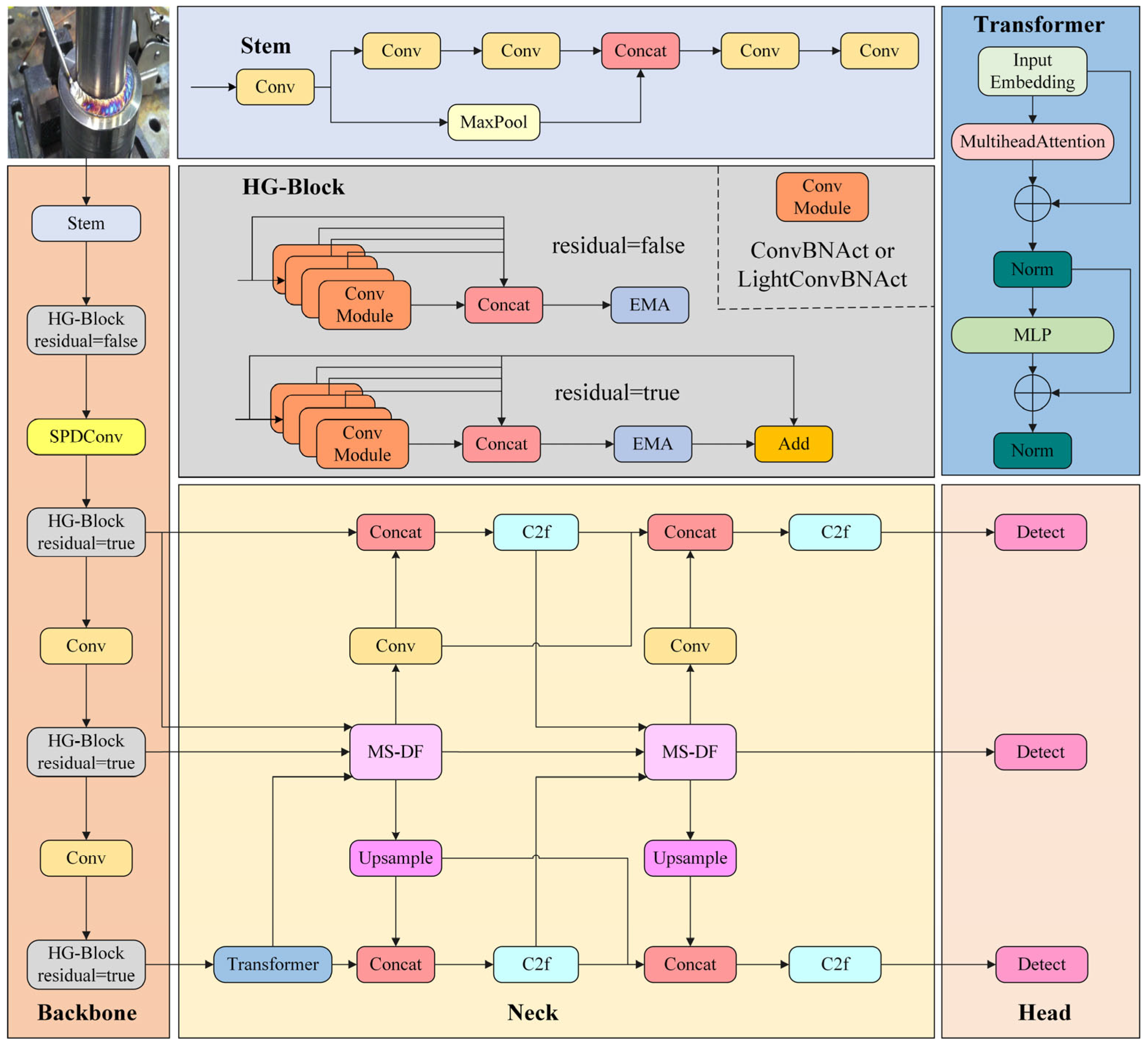 Figure 1. To enhance the network’s performance in detecting targets of different scales, this paper modifies the HGNetv2 backbone structure of the original DEIM model. First, in the backbone network, the original Stage 2 spatial downsampling module is replaced with an SPD-Conv module. SPD-Conv achieves more efficient information compression through spatial pyramid depth convolution while preserving rich spatial details and multi-scale semantic perception capabilities. Since SPD-Conv requires a large receptive field to capture spatial pyramid features, its effects are not prominent in shallow feature maps. Therefore, it is only replaced in Stage 2 to achieve the best balance. Secondly, to address the issue of target details being weakened during continuous convolution, the EMA attention mechanism is introduced into all HG-Block modules. This module effectively improves the network’s modeling capacity of small targets and conspicuous features in complex background by adaptively increasing spatial and channel information and directing the network to concentrate on crucial locations. Finally, to further improve feature fusion capabilities, we replace the neck structure based on FPN and PANet in the original model with an innovatively improved FTPN architecture. The FTPN structure combines multi-scale diffusion (MS-DF) with a Transformer encoder, which enables precise fusion of features across scales while incorporating global context, enhancing the recognition of defects of varying sizes and types. The selective application of the Transformer encoder to deep features ensures a balance between computational efficiency and performance. Collectively, this integration of three modules provides a unique framework that addresses the specific challenges of welding defect detection—including small target sizes, complex backgrounds, and diverse defect types—and provides superior accuracy and robustness compared to conventional approaches.