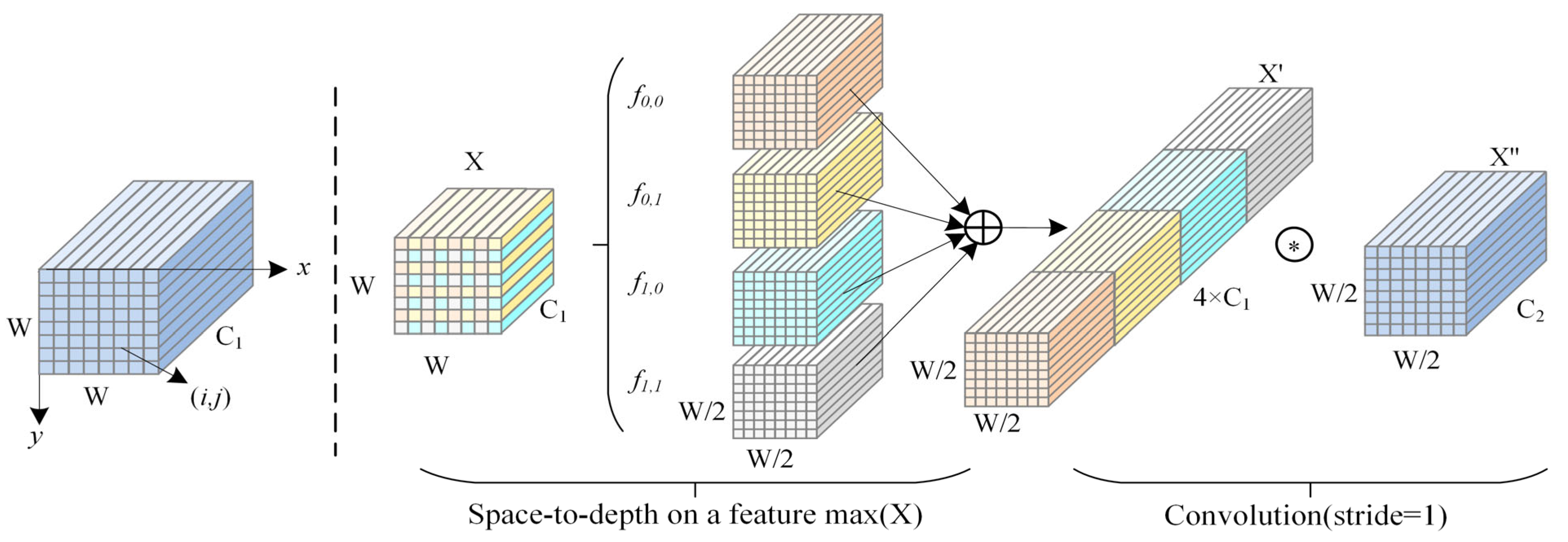 Figure 2. First, a Space-to-Depth transformation is applied to the input feature map by specifying a stride S, which partitions and rearranges the spatial dimensions accordingly. The input feature map X has a shape of W × W × C1; it is divided into S2 sub-feature maps