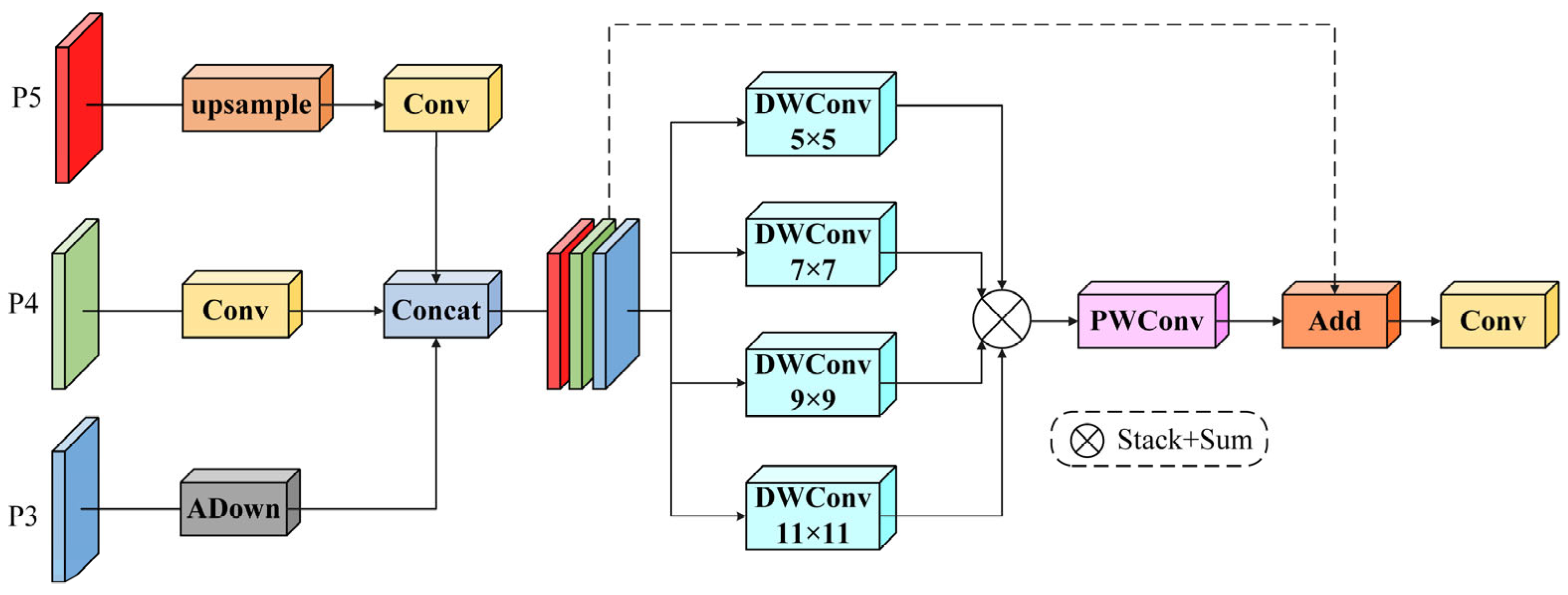 Figure 4. This module first divides the input feature map and performs different operations based on scale differences. The input P3 layer undergoes feature downsampling via the Adown module, reducing the input feature size while extracting more representative features, thereby preserving low-level detail information. The input P4 layer passes through a convolutional layer, while the input P5 layer first undergoes upsampling followed by convolution. Subsequently, the concatenated features are processed through multi-core deep convolutional aggregation, which can be formally expressed as: