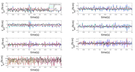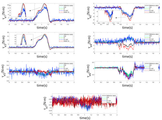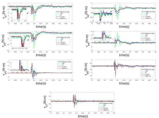 The initial value of the process noise is set as follows: . The observation noise covariance is set to the current actual value. The initial values and is set to 8. Main parameters of ESO: , . Main parameters of KF: = 80,000I. Main parameters of SH-AKF: = 40,000I, . Main parameters of AETE: = 80,000I, , .