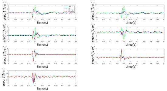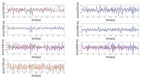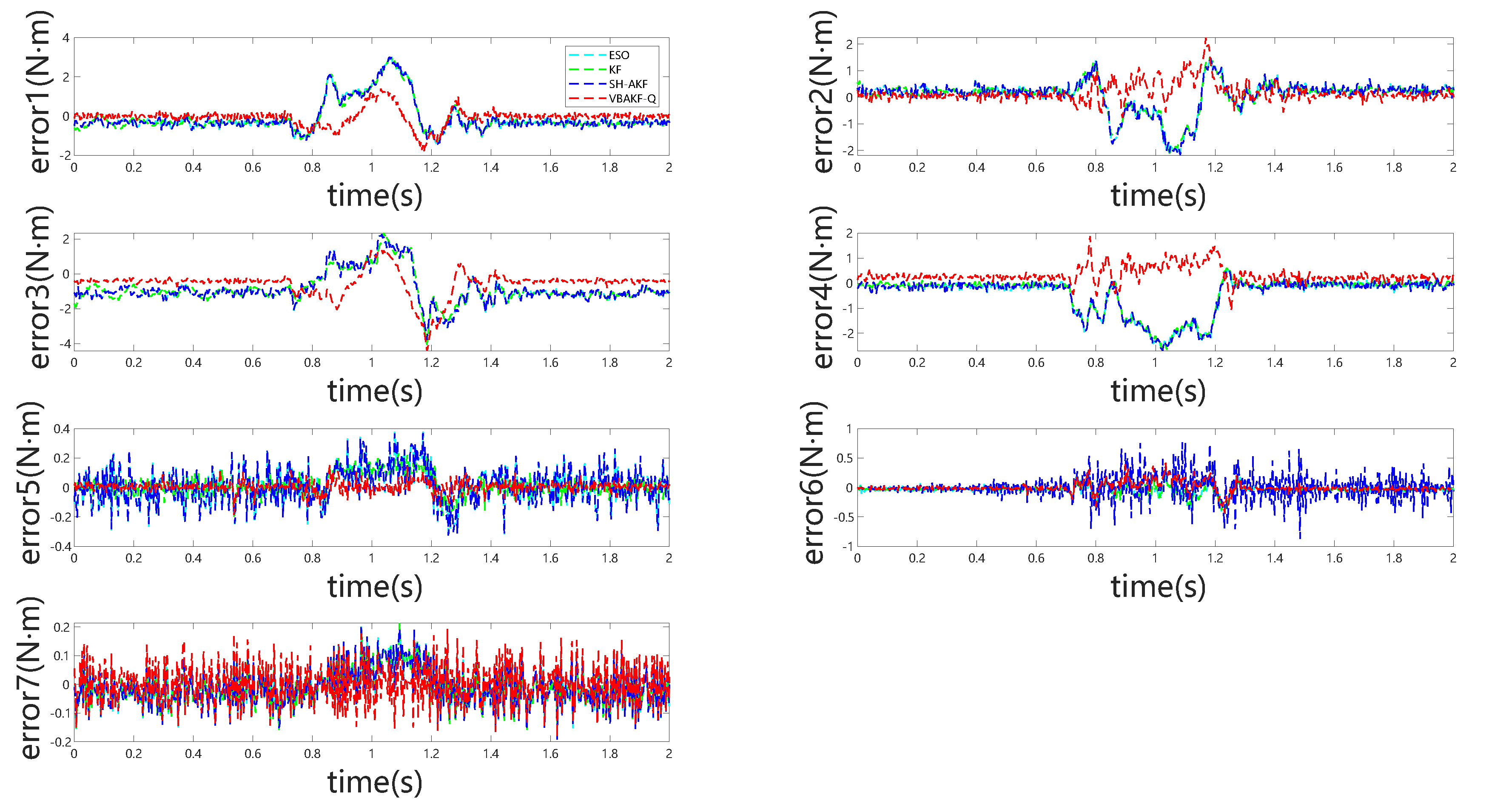 Figure 7 depicts joint torque estimation during a brief (0.5 s) interaction with a compliant object (human hand) at the robotic arm’s end-effector, showing the external torque observations from the different observers. When the robotic manipulator collides with a compliant object, the advantages of VBKFMO-Q become particularly pronounced, especially in the first three joints, where it demonstrates markedly superior torque estimation accuracy and response speed compared to other torque observers of the same class. The corresponding joint-wise estimation error curves are presented in
