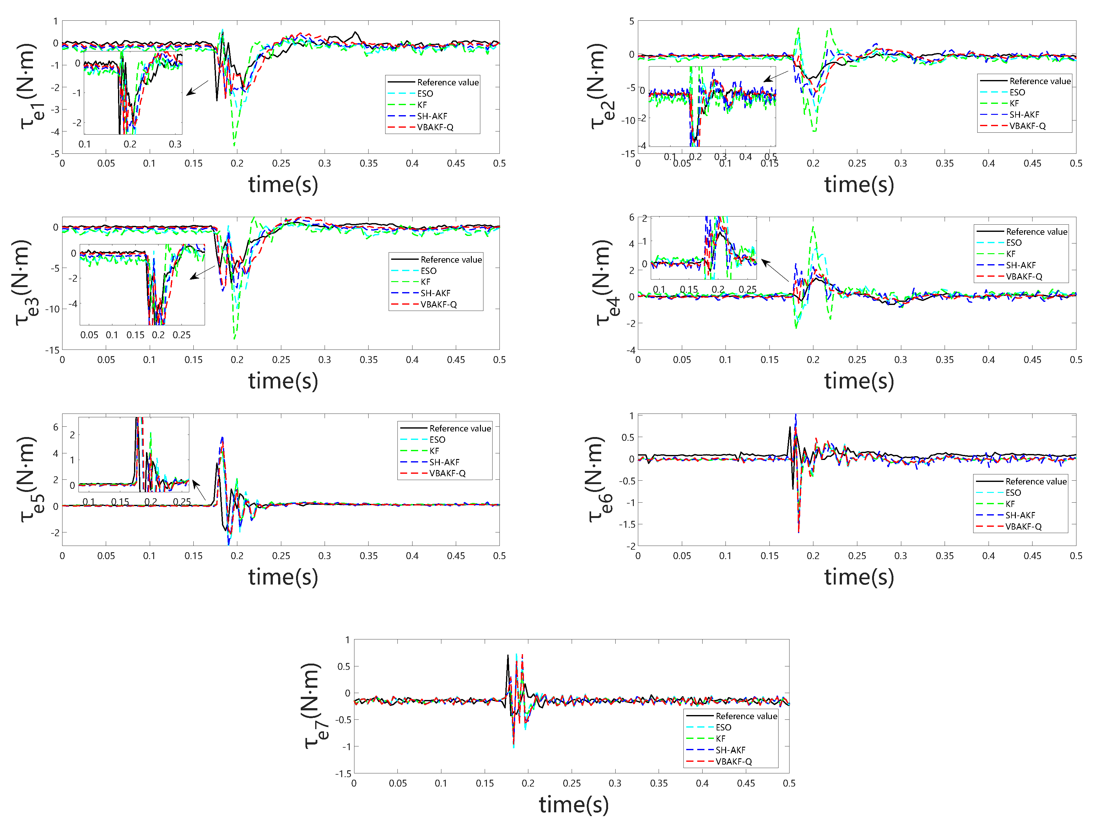 Table 1. External torque of the Franka arm under collision-free conditions was estimated using ESO, KFMO, SH-AKFMO, and VBKFMO-Q.