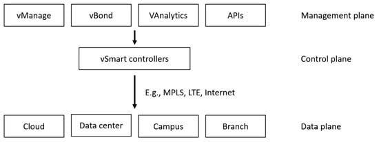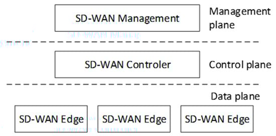 A distinctive feature of SD-WAN, in addition to those mentioned above, is the separation of the data transport plane from the network control and management plane, which is, of course, a characteristic of SDN technology. In SD-WAN, traffic management policies, including security policies, are created by the management plane, implemented by the control plane, and enforced by the data transfer plane [7,8]. The SD-WAN layered approach is shown in Figure 1. This approach coincides with the software-defined network model, which is based on three layers: application, control, and data. The use of a centralized approach to controlling data plane elements (SD-WAN edges) allows flexible management of the wide area network, adapting its characteristics to the capabilities offered by the available links and networks.
