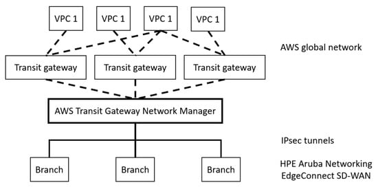 Silver Peak offers another SD-WAN solution aimed at large organizations and service providers [43,59], which was acquired by Hewlett Packard Enterprise (HPE) in 2020 and was integrated into the Aruba brand as EdgeConnect. The platform features a strong focus on automation, advanced control over routing, and application optimization, as well as full integration with security mechanisms and cloud services. A key feature of Silver Peak is advanced application control based on business policies, cloud connection automation, and WAN compression/acceleration. This is realized by optimally utilizing available bandwidth, compressing data, and reducing packet delays, thus enabling faster data transmission and improving application performance—especially for applications that generate high data flows. The ability to migrate from MPLS to low-cost Internet connections without sacrificing quality of service is also an important advantage of this solution. Figure 5 presents the architecture of Silver Peak SD-WAN, which is natively integrated with the Amazon Web Services (AWS) cloud infrastructure. The figure highlights AWS, consisting of Virtual Private Clouds (VPCs) accessed via Transit gateways. According to the SD-WAN philosophy, traffic control between system components is centralized through the use of AWS Transit Gateway Network Manager. This manager is also responsible for automatically preparing secure and encrypted IPsec tunnels to remote sites that use HPE Aruba EdgeConnect SD-WAN-based devices. Such devices enable dynamic path selection, WAN optimization, and enforcement of QoS and security policies. Silver Peak SD-WAN, integrated into the Aruba EdgeConnect platform, is distinguished by advanced application optimization as well as traffic compression and acceleration mechanisms, which enable more efficient use of available bandwidth in resource-constrained environments. This approach can be beneficial in the context of SATCOM, where latency and narrow throughput represent major challenges. Another advantage is the ability to migrate from MPLS to lower-cost Internet connections without sacrificing quality, which is relevant for military networks requiring flexibility in accessing diverse types of infrastructure. Nevertheless, the centralization of control in AWS cloud and the extensive reliance on automation may generate additional signaling overhead, while the dependency on stable Internet connectivity limits the applicability of this solution in satellite environments exposed to interference and transmission disruptions.