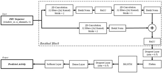 The model implemented in this study was structured identically to the architecture outlined by Li and Wang []. In short, there are two major components within the model: a residual network (ResNet) block and a bidirectional long short-term memory (BiLSTM) block. The ResNet is used to extract spatial features from the signal, while the BiLSTM captures the forward and backward temporal information from time sequences (Figure 2). Together, these components combine to form a framework that is capable of learning both spatial patterns and long-range temporal dependencies, which are both essential for modeling human movement.