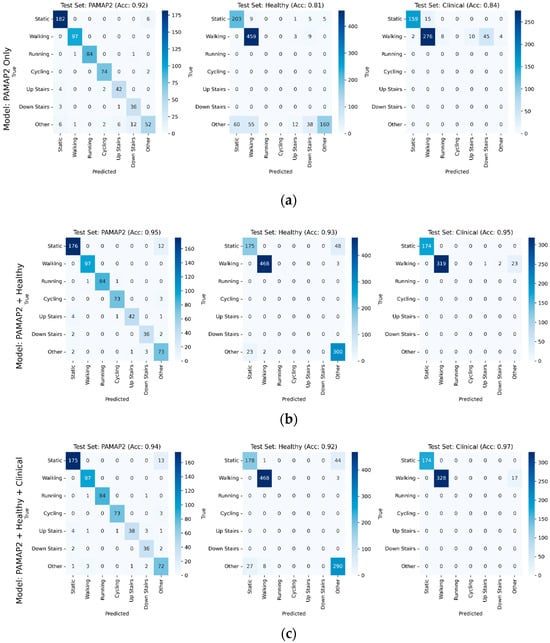 Confusion matrices broken out individually for PAMAP2, healthy, and clinical testing sets, with accuracy for each testing set shown for each model, for models using in training (a) PAMAP2 only, (b) PAMAP2 + Healthy datasets, and (c) PAMAP2 + Healthy + Clinical. Model performance generally improved on test sets as additional data was incorporated into training.