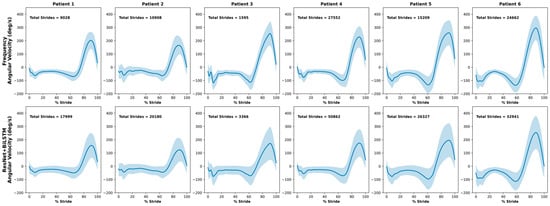 The average normalized mediolateral angular velocity waveforms for each participant in the clinical test set, obtained using each gait detection method, are shown in Figure 4. The mediolateral angular velocity captures the primary swing component of gait and is therefore distinctive in representing a consistent motion pattern. With the exception of Patient 3, who only had one day of data before removing the sensors, the remaining participants had at least four days of data. On average, 14,826 strides were identified with the frequency-based method compared to 25,279 strides with the ML method.