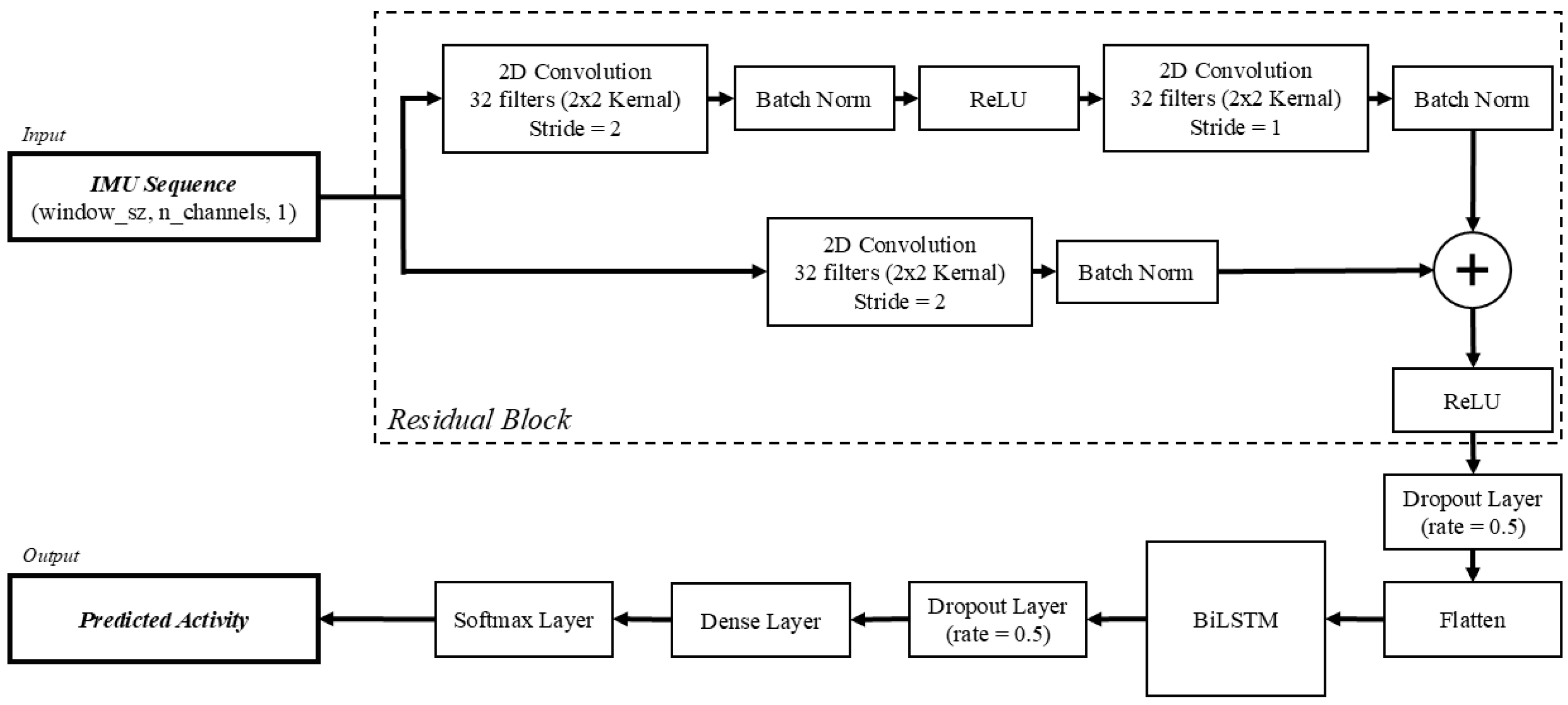 17]. The architecture consists of two main components: (1) the residual convolutional 2D block, which extracts features from a window of the IMU data, and (2) the bidirectional LSTM network, which captures long-range dependencies and reduces information loss in sequential data. This model’s architecture is particularly intriguing because it has demonstrated strong performance across various datasets, ranging from those with multiple sensor placements to a single sensor positioned just below the knee. Specifically, the authors found that the model identified activities with over 95% accuracy when trained independently across three datasets: the full PAMAP2 dataset, another open dataset (WISDM), and a lab-created dataset with a single proximally placed sensor on the shank. While these findings are promising, they share limitations common to many models, as highlighted in a recent review [