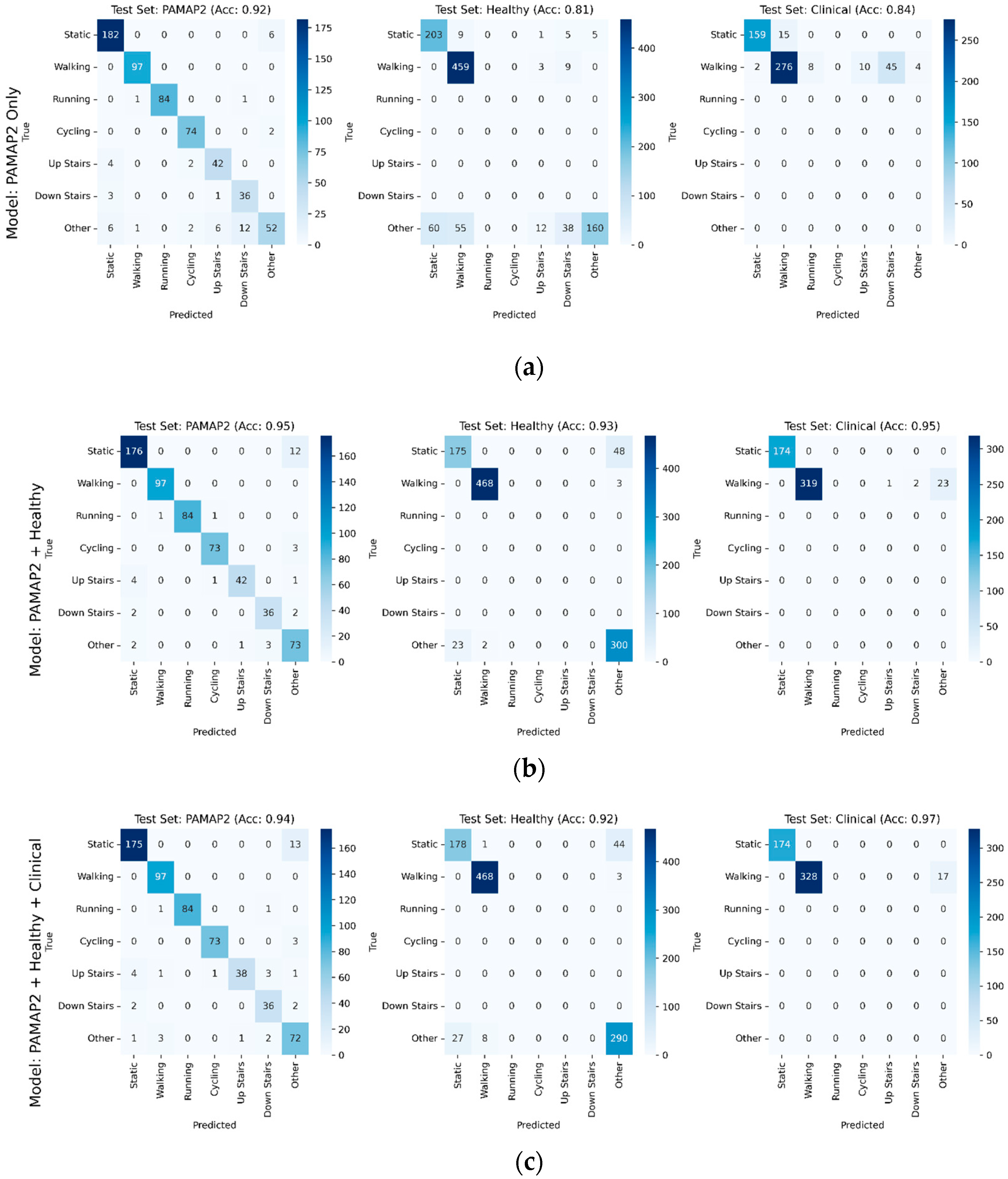 Figure 3a). However, augmenting the PAMAP2-only model described by Li and Wang with additional clinical training data improved its performance, reaching 97% accuracy (