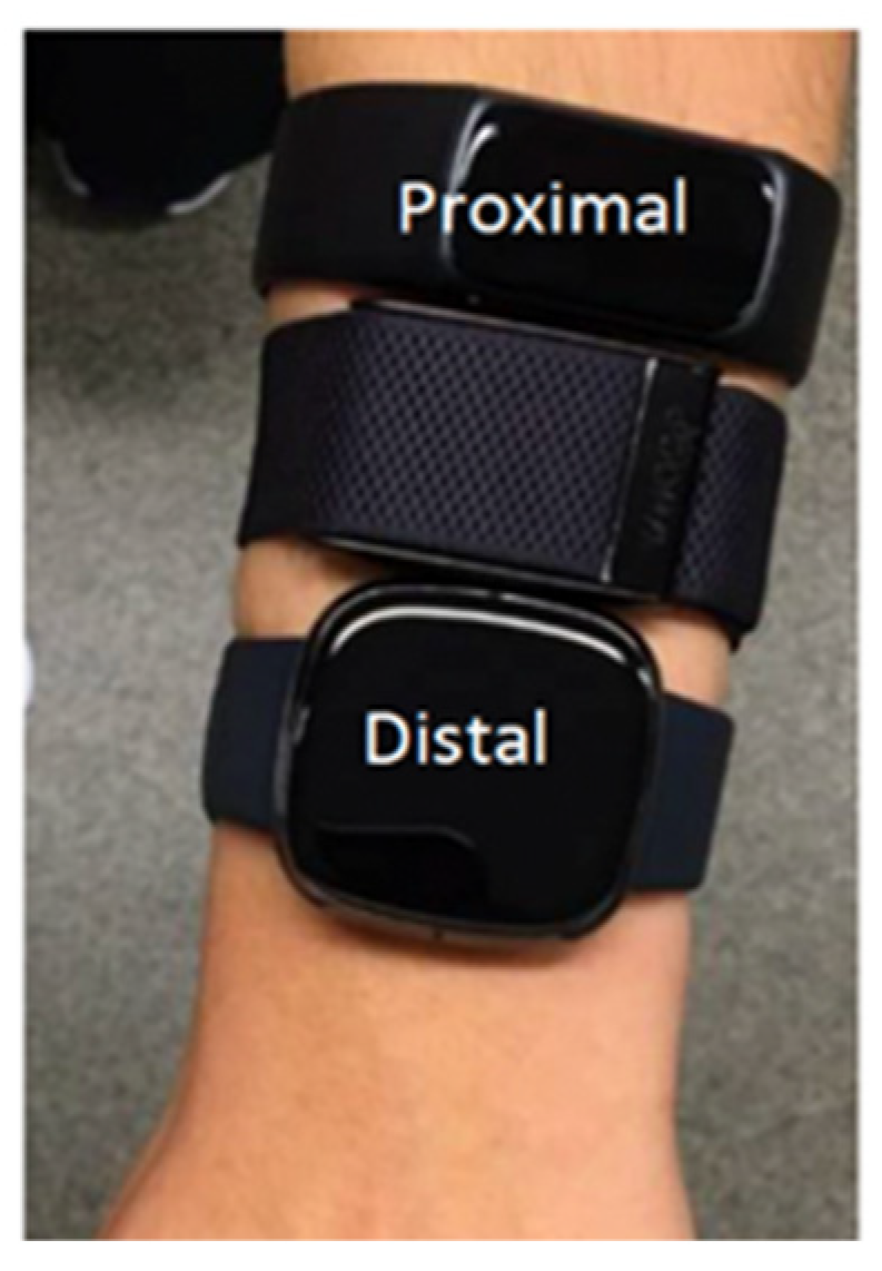 - Germini, F.; Noronha, N.; Borg Debono, V.; Abraham Philip, B.; Pete, D.; Navarro, T.; Keepanasseril, A.; Parpia, S.; de Wit, K.; Iorio, A. Accuracy and acceptability of wrist-wearable activity-tracking devices: Systematic review of the literature. J. Med. Internet Res. 2022, 24, e30791. [Google Scholar] [CrossRef] [PubMed]