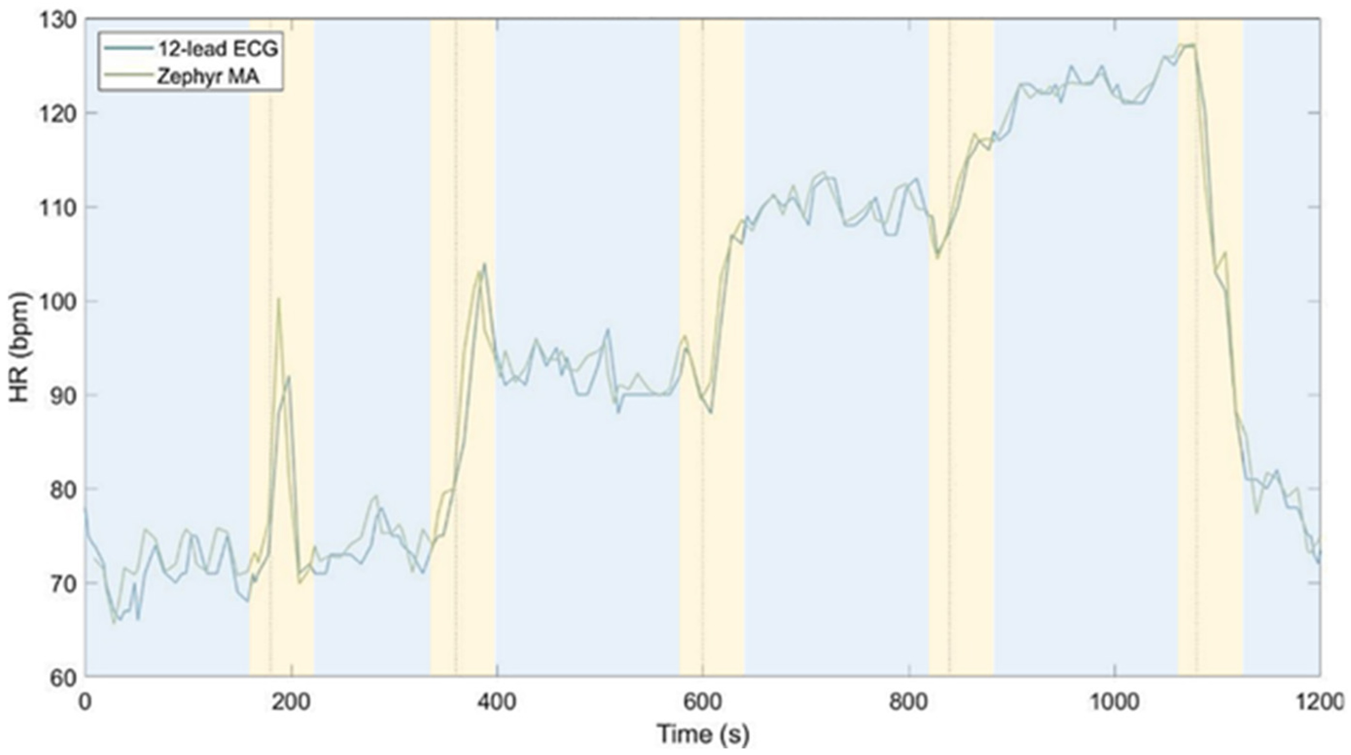 - Kim, J.H.; Roberge, R.; Powell, J.B.; Shafer, A.B.; Williams, J. Measurement accuracy of heart rate and respiratory rate during graded exercise and sustained exercise in the heat using the Zephyr BioHarness. Int. J. Sports Med. 2013, 34, 497–501. [Google Scholar] [CrossRef] [PubMed]