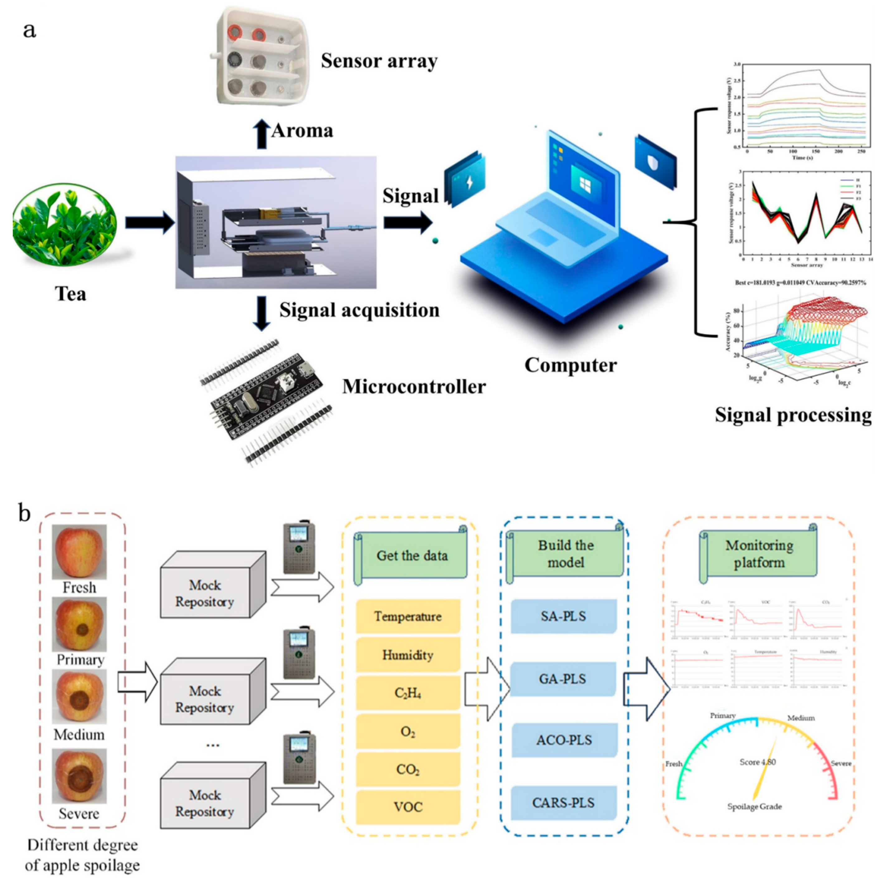- Yin, L.; Jayan, H.; Cai, J.; El-Seedi, H.R.; Guo, Z.; Zou, X. Spoilage Monitoring and Early Warning for Apples in Storage Using Gas Sensors and Chemometrics. Foods 2023, 12, 2968. [Google Scholar] [CrossRef]