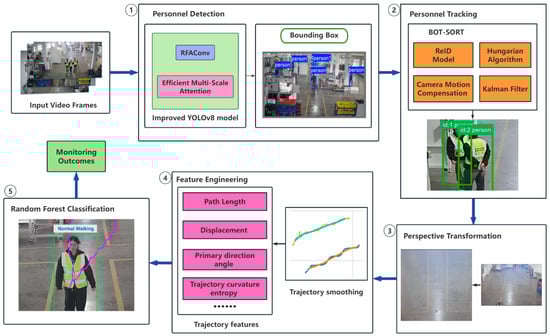 In the era of Industry, the automated recognition of personnel behavior within environments such as manufacturing plants and logistics centers is critical for ensuring operational safety and enhancing production efficiency [,,]. Traditional monitoring methods that rely on manual inspection are often inadequate for the dynamic and large-scale nature of modern industrial settings due to inherent limitations in response time, coverage, and labor costs. Consequently, vision-based intelligent surveillance systems have emerged as a vital technology [,]. By analyzing the motion trajectories of individuals [], these systems can provide a means of understanding behavior, enabling proactive safety alerts and optimizing management workflows.