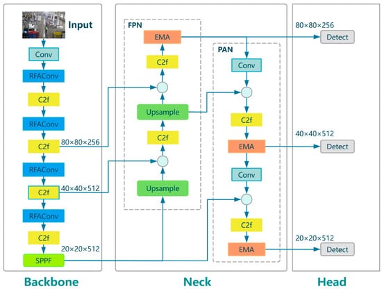 In complex industrial scenarios, the baseline YOLOv8n model encounters two main challenges for personnel detection. The first involves missed detections of distant targets due to inadequate feature representation. Second, localization drift is caused by environmental lighting noise. This limitation stems from the spatial invariance inherent in standard convolution, which inhibits location-sensitive feature extraction, compounded by the lack of cross-channel interaction mechanisms in the Neck network, impairing feature fusion under occlusion. An improved YOLOv8n model is developed for industrial personnel detection. The RFAConv module (denoted by dark blue blocks in Figure 3) is integrated into the Backbone network. By constraining attention weight generation to convolutional kernels’ physical receptive fields, it enables dynamic adaptive enhancement of local features. This design significantly enhances structural representation capability, boosting feature response intensity for distant personnel. Additionally, the EMA module (marked by orange blocks in Figure 3) is embedded in the Neck network. Its parallel cross-channel interaction mechanism compensates for information loss from occlusion and strengthens the semantic fusion of multi-scale features. The overall architecture of the improved YOLOv8 is illustrated in Figure 3.