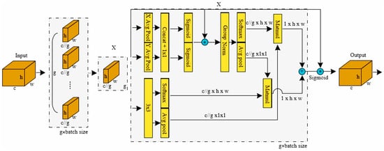It encodes global information and models long-range dependencies. Softmax is applied to 2D global average pooling outputs for linear adaptation. Matrix dot products of parallel-processed outputs generate the first spatial attention map, aggregating multi-scale spatial information. Similarly, 3 × 3 and 1 × 1 branches undergo global pooling, with 1 × 1 outputs reshaped for joint channel activation to produce the second precise spatial attention map. Fused attention weights processed through Sigmoid yield grouped feature maps, capturing pixel-wise relationships and global context.