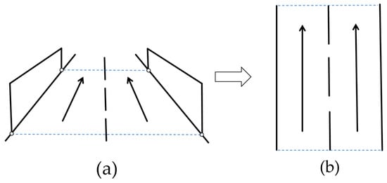 Perspective transformation schematic: (a) original camera view; (b) top-down bird’s-eye view after transformation.