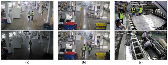 Sample images from the curated industrial dataset: (a) varied illumination conditions; (b) significant scale variation in personnel; (c) diverse industrial scenes.