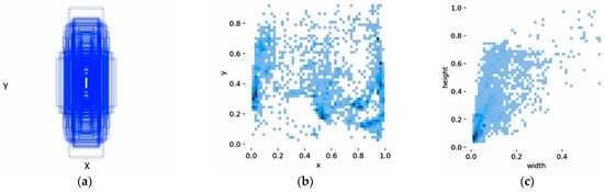 Statistical information of the object detection dataset: (a) size distribution of object bounding boxes; (b) scatter plot of bounding box width versus height; (c) spatial distribution of object locations.