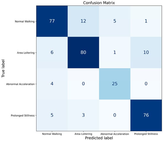 The optimized Random Forest classifier was trained on the augmented training data and evaluated on the original, unseen test set. The classification performance is detailed in the confusion matrix (Figure 15) and summarized in Table 5. The results indicate that the model achieves high accuracy across all four behaviors, with precision, recall, and F1-score values consistently exceeding 82%. The successful recognition of the ‘Abnormal Acceleration’ class, in particular, validates the effectiveness of our combined data augmentation and model optimization strategies.