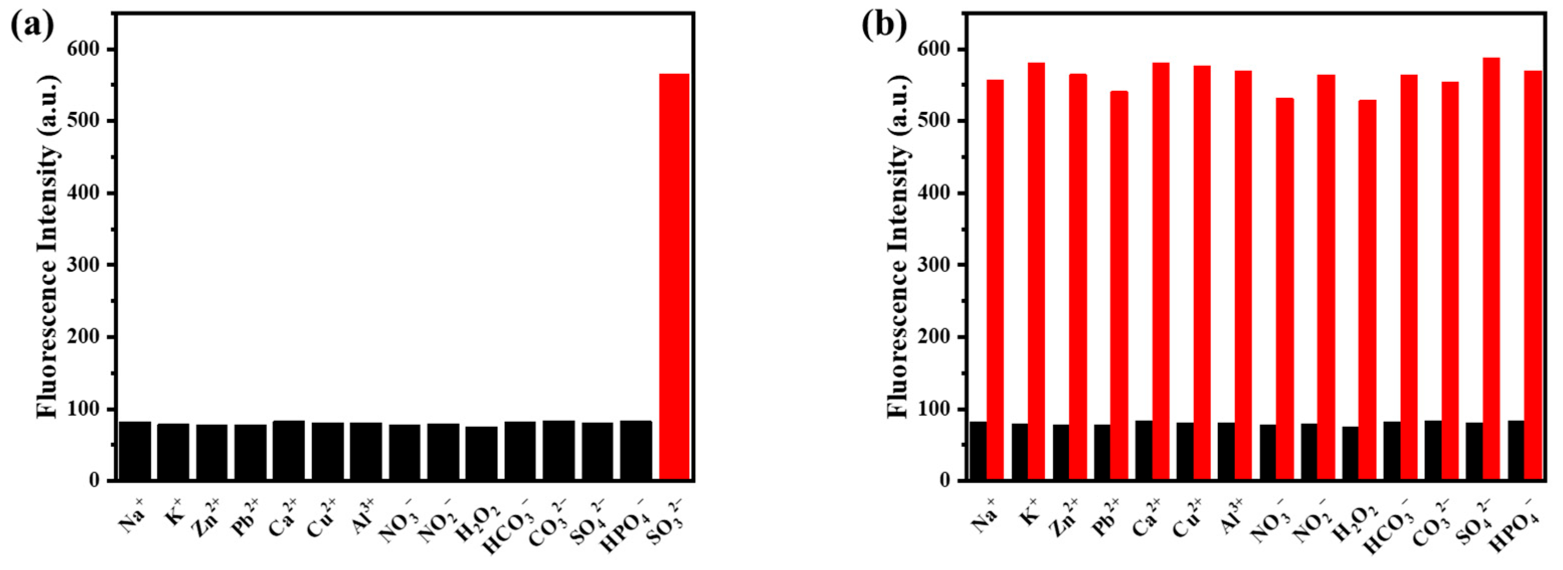 - Dutta, K.; Chattaraj, S.; Pal, R.; Jonnalgadda, P.N.; Patro, B.S.; Mula, S.; Chakraborty, G. A Kumujian-C based highly selective fluorescence turn-on probe enables the detection of sulfite in real samples and living cells. New J. Chem. 2024, 48, 9961–9969. [Google Scholar] [CrossRef]