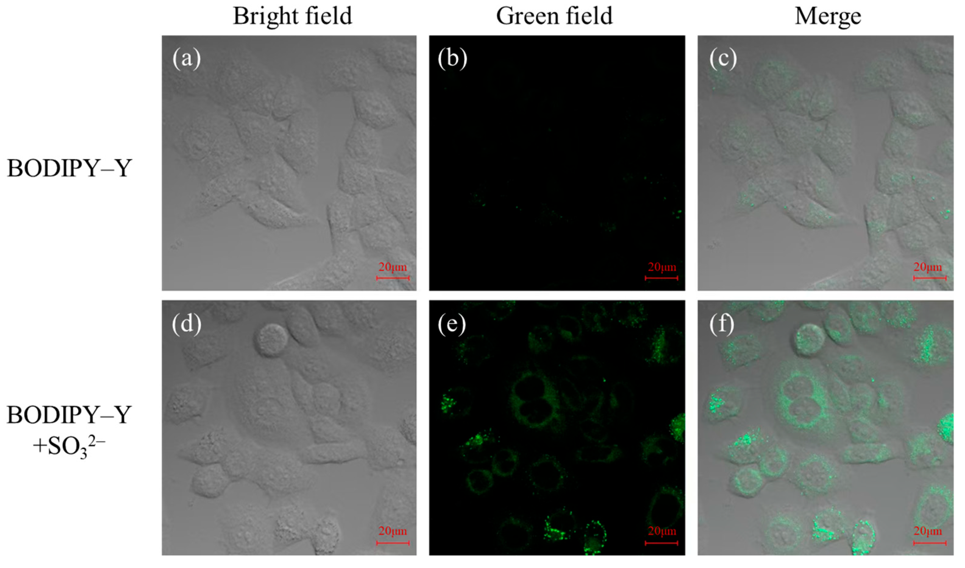 - Liu, Y.; Wu, Y.-X.; Zhang, D.-L.; Xi, Y.; Yu, S.-R.; Zhong, H.-M.; He, K.-D.; Li, D.; Wei, W.-T.; Cao, Y.-T.; et al. A BODIPY-Hemicyanine-Based Water-Soluble Dual-Color Fluorescence Probe for Colorimetric Monitoring of Intracellular Endogenous Sulfur Dioxide and Bioimaging Applications. ChemistrySelect 2020, 5, 3033–3040. [Google Scholar] [CrossRef]