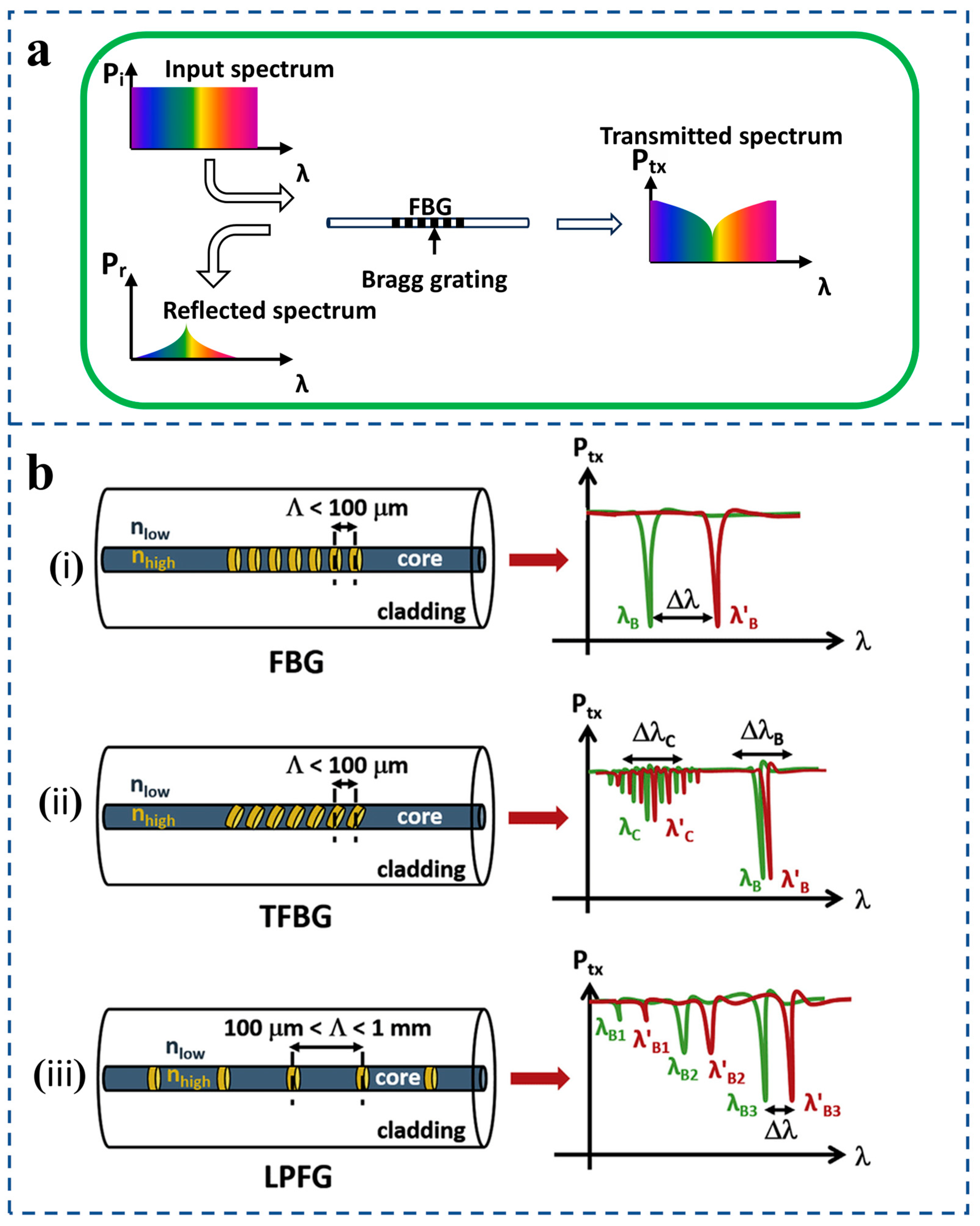 - Li, L.-J.; Ma, H.; Zhang, Y.L.; Sui, T.; Lai, Y.Z.; Li, J.; Cao, M.-Y. Simulation of reflection spectrum of FBG with uniaxial anisotropic crystal cladding. Acta Phys. Sin. 2012, 61, 130201. [Google Scholar] [CrossRef]