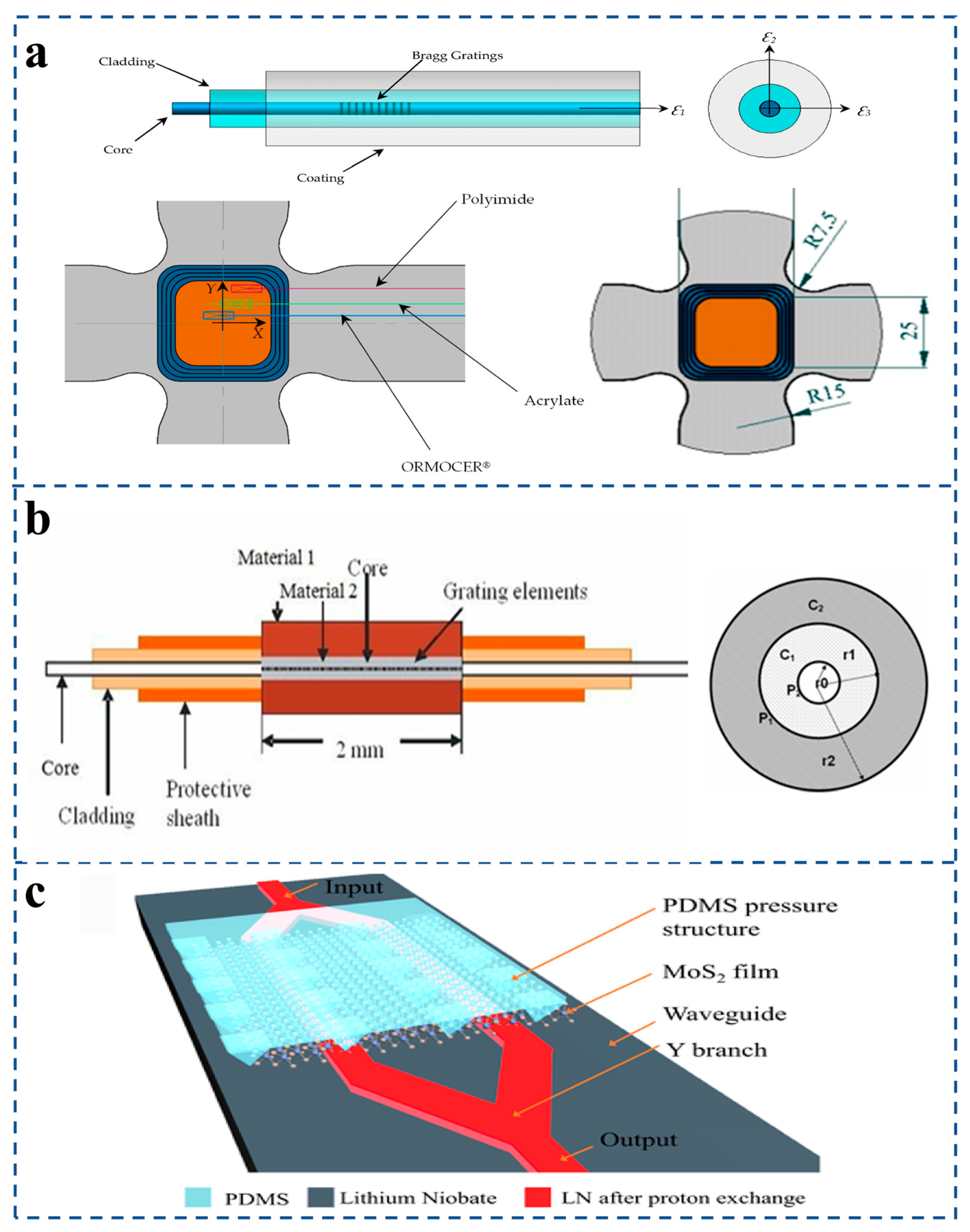 - González-Gallego, M.; Terroba Ramírez, F.; Martínez-Vicente, J.L.; González del Val, M.; López-Cela, J.J.; Frövel, M. Fiber Bragg Gratings Sensor Strain–Optic Behavior with Different Polymeric Coatings Subjected to Transverse Strain. Polymers 2024, 16, 1223. [Google Scholar] [CrossRef]