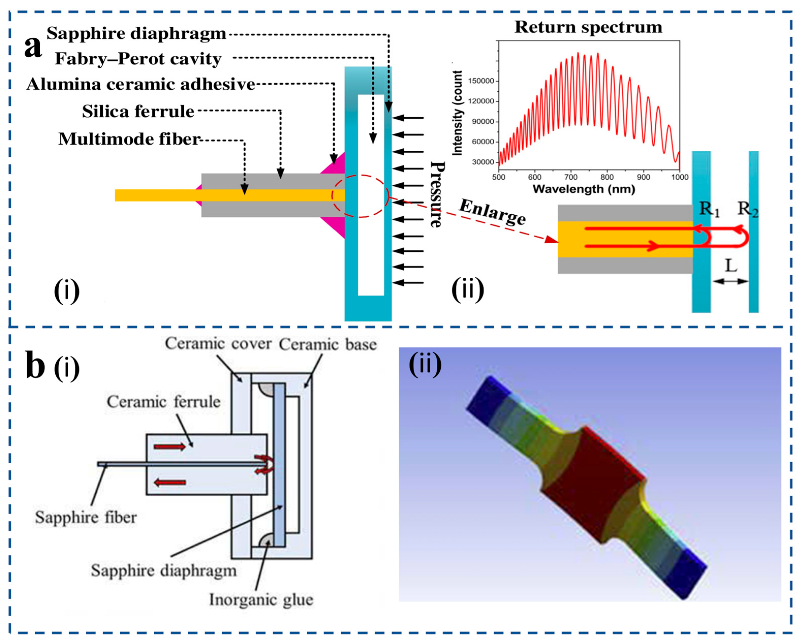 - Li, W.; Liang, T.; Jia, P.; Lei, C.; Hong, Y.; Li, Y.; Yao, Z.; Liu, W.; Xiong, J. Fiber-optic Fabry–Perot pressure sensor based on sapphire direct bonding for high-temperature applications. Appl. Opt. 2019, 58, 1662–1666. [Google Scholar] [CrossRef]