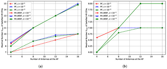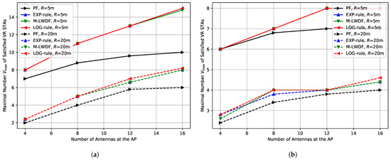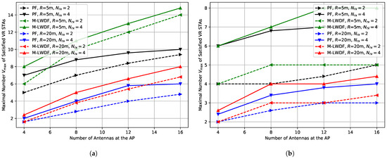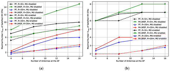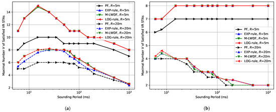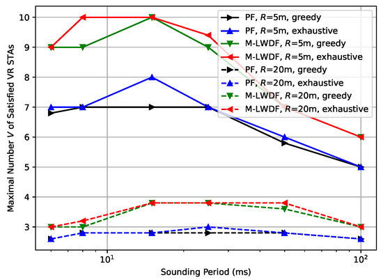 Next, we estimate the maximal number V of VR STAs that can be satisfied for a given sounding period, which is defined by (12). Figure 2a shows the results for the case of antennas at the AP and low environmental speed ( kmph) for different schedulers and network radius R.