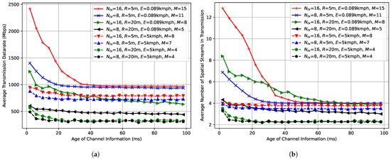 Impact of the age of channel information on: (a) average transmission data rate, (b) average number of spatial streams.