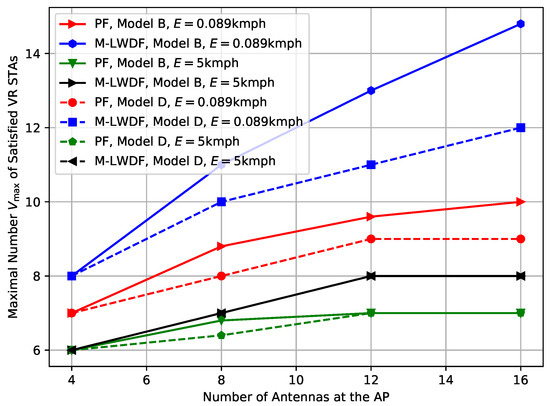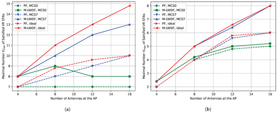 Figure 9b shows the dependence of the maximal number of the satisfied VR STAs depending on the number of antennas for low environmental speed ( kmph) and large network radius ( m). In this case, the ideal MCS selection algorithm has to use more robust MCSs, so the difference between the Ideal and MCS7 notably decreases. In contrast, MCS0 notably decreases the gain from increasing the number of AP antennas. Also, when MCS0 is used, we almost do not see the difference between PF and delay- aware schedulers.