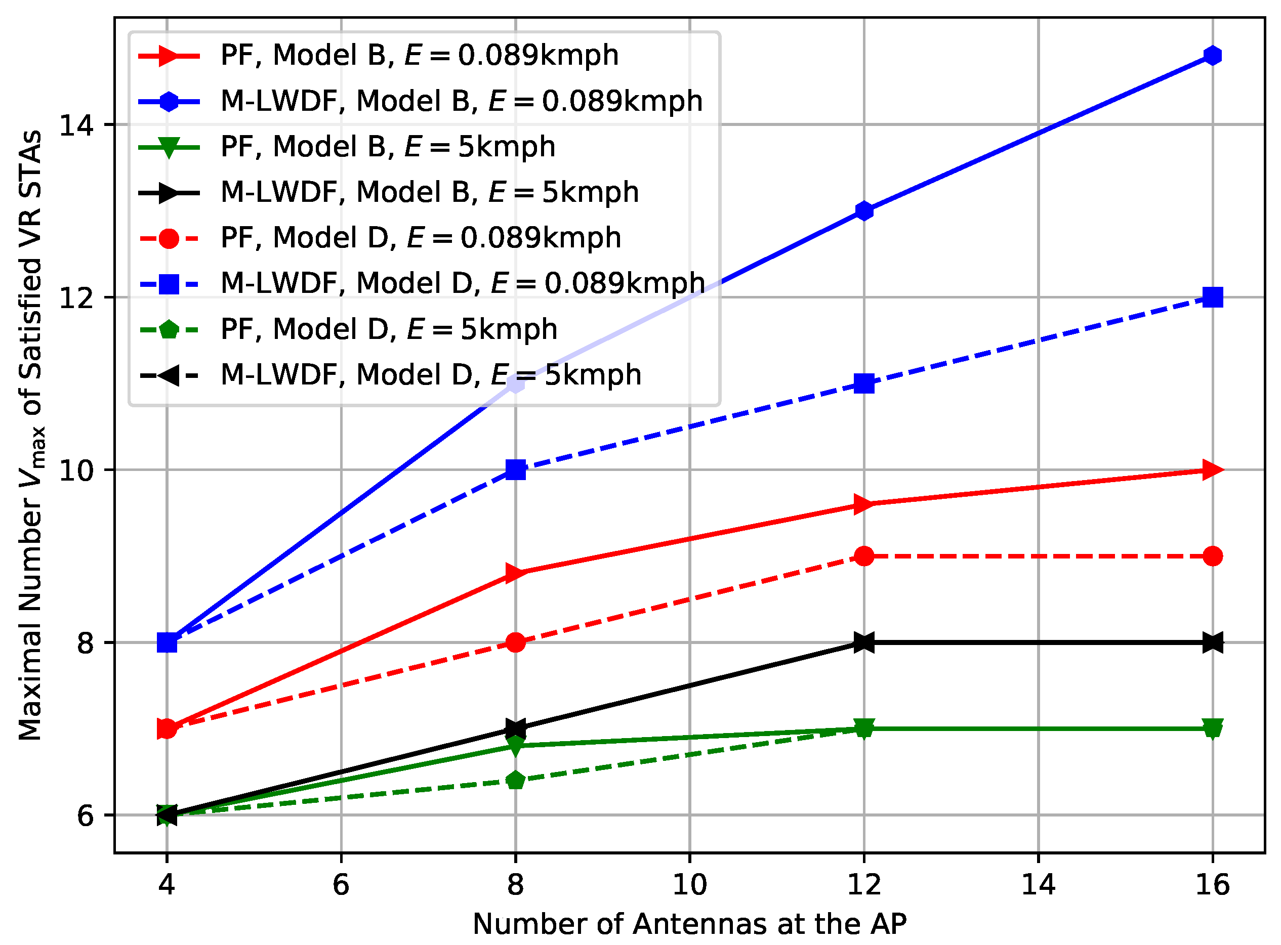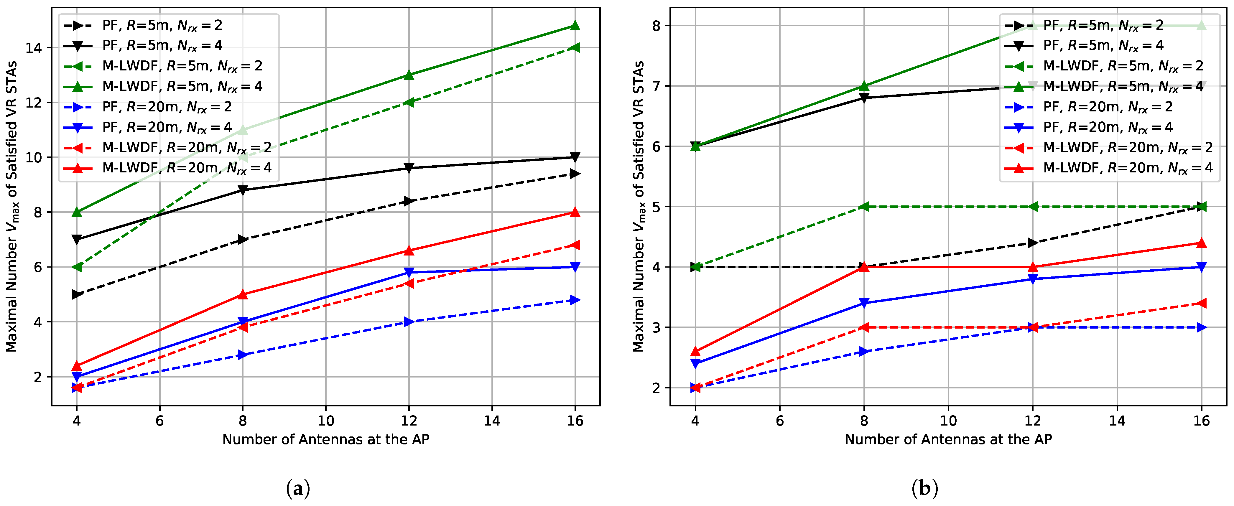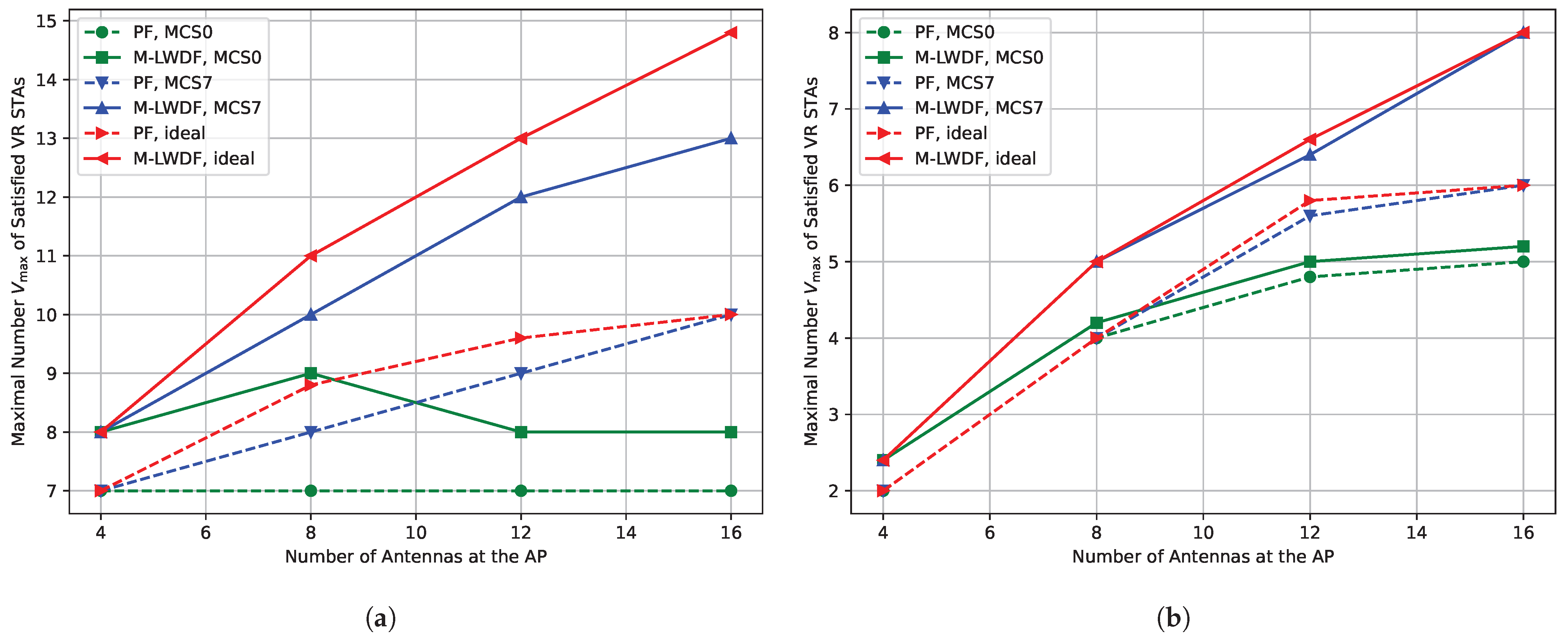 - We built an ns-3-based simulation framework (the framework can be requested at https://wnlab.ru/wifi-mumimo-simulator, accessed on 27 August 2025) to evaluate Wi-Fi performance in VR scenarios with MU-MIMO support and the ability to use up to 16 antennas/spatial streams at the AP, which is not supported yet by the current Wi-Fi standard. The framework allows modeling explicit sounding procedure and channel aging, includes a realistic VR application model [21] and different delay-aware schedulers [12].