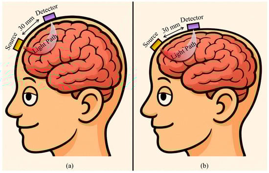 fNIRS is a non-invasive neuroimaging technique that measures brain activity by detecting changes in cerebral blood oxygenation. fNIRS systems transmit NIR light through tissue layers the scalp-muscle, cranium, cerebrospinal fluid (CSF), and brain, and capture the light that is scattered back, allowing for the estimation of oxygenated and deoxygenated hemoglobin concentrations in the underlying cortical tissue. Since these hemodynamic changes are tightly coupled with neuronal activity, fNIRS provides an indirect yet reliable measure of brain function [,]. Its portability, affordability and motion tolerance make it especially suitable for populations and environments where traditional neuroimaging methods, such as functional magnetic resonance imaging (MRI) or positron emission tomography, are impractical, such as infants, individuals with movement disorders, or real-world behavioral experiments [,]. Furthermore, its safety, comfort, and scalability support repeated lengthy measurement sessions. These features position fNIRS as a highly promising tool for cognitive neuroscience, neurorehabilitation, psychiatry, and brain–computer interface applications []. Its growing use in occupational training, such as surgery and aviation, highlights fNIRS’s potential to objectively assess real time learning and decision-making in high-risk environments [,,].