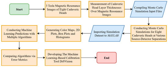 The methodological workflow begins with MRI scans of cadaveric heads, followed by the measurement of head layer thicknesses, MC simulations, post-processing of simulation outputs, ML modeling and evaluation, and the development of the ML-based calibration tool, DrSVision. A summary of the full workflow is presented in the flowchart in Figure 2.