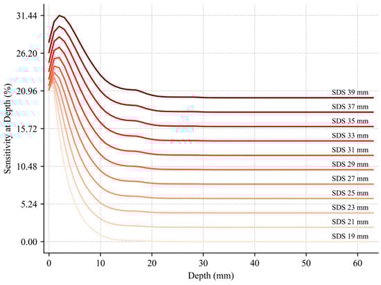 To evaluate how SAD varies with different SDSs, mean SAD profiles were computed for SDSs ranging from 19 to 39 mm. For each SDS, mean SAD values across all cadaveric heads were computed to generate representative curves (see Figure 4). These profiles illustrate how the distribution of SAD changes with depth under varying geometric configurations. Since each cadaveric head has distinct anatomical features such as different scalp, skull, and CSF layer thicknesses, the mean profiles reflect SAD behavior across a diverse set of head geometries. Notably, the depth at which SAD reaches its maximum shifts progressively from approximately 0 to 2 mm as the SDS increases from 19 to 39 mm. This trend is consistent with established findings in the literature and reflects the expected behavior of photon migration in layered head tissue [,,]. To minimize overlap and improve visual clarity, each curve was vertically shifted in 2% increments. This visualization enables the direct comparison of SAD trends across a range of SDS, independent of cadaveric head-specific variations. For each SDS, the corresponding plot showing SAD vs. depth curves for all eight cadaveric heads is provided in the Supplementary Materials to illustrate inter-subject variability and support further comparison across individual anatomical structures.