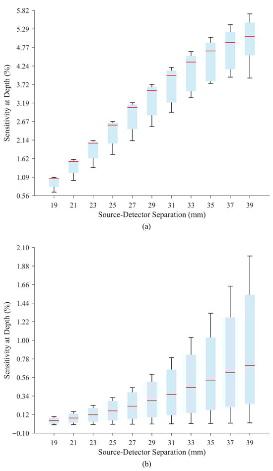 Some recent studies have attempted to improve anatomical specificity by aligning source-detector positions with standardized head models or using MRI-guided probe placement [,,]. While these methods enhance spatial alignment, they often fall short of offering quantitative strategies for adjusting SDS to optimize the SAD of interest. To advance fNIRS as a study-oriented neuroimaging modality, calibration strategies must be tailored to both anatomical and experimental contexts. Region-specific optimization of SDS is therefore essential to ensure that measurements are anatomically relevant and spatially accurate, particularly when targeting regions located at varying cortical depths [].