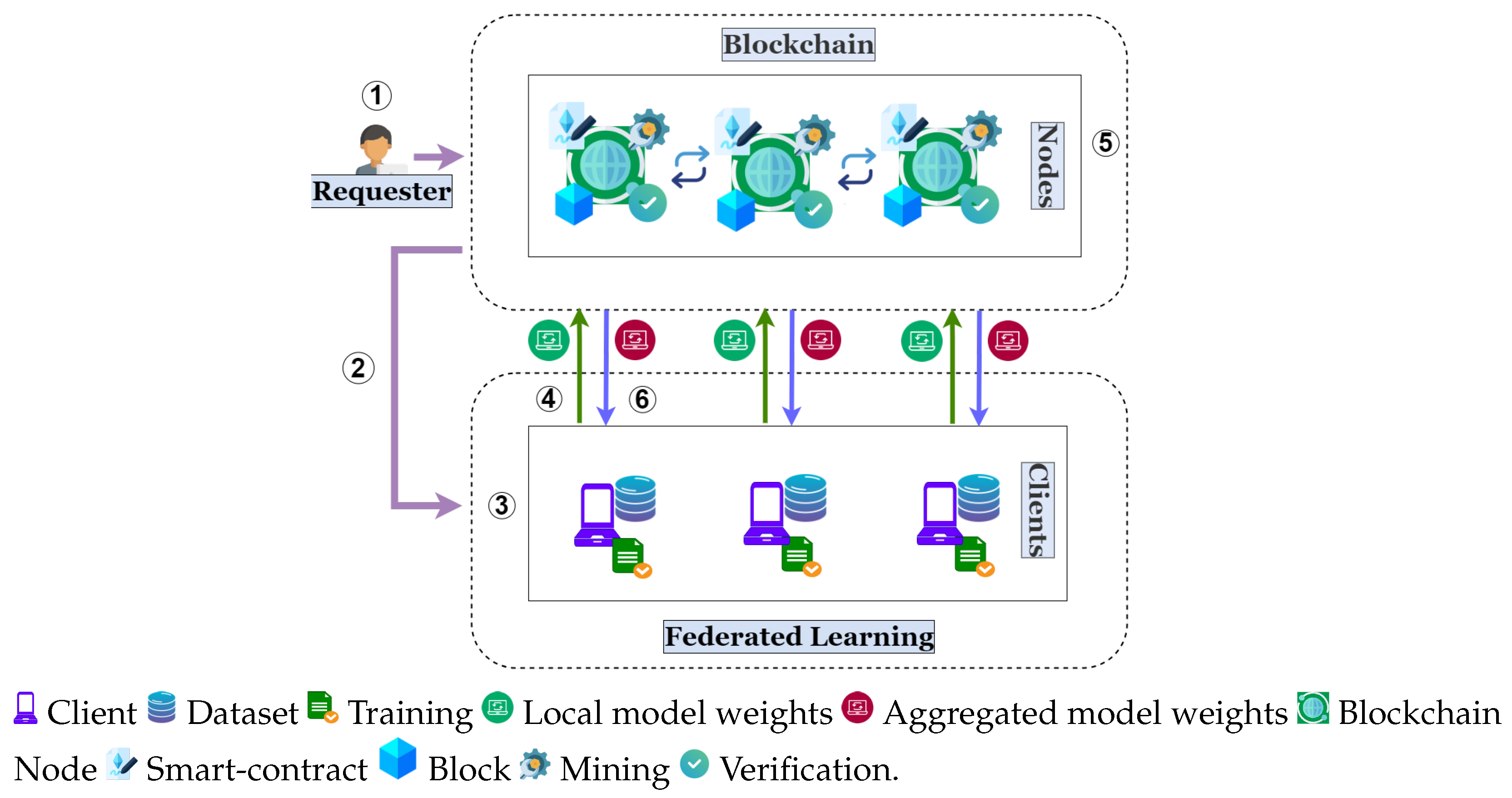 - Step 5: Blockchain nodes collectively verify the local model weights from clients and record them on the blockchain ledger (in terms of transactions). They also aggregate these local model weights and generate the new global model.