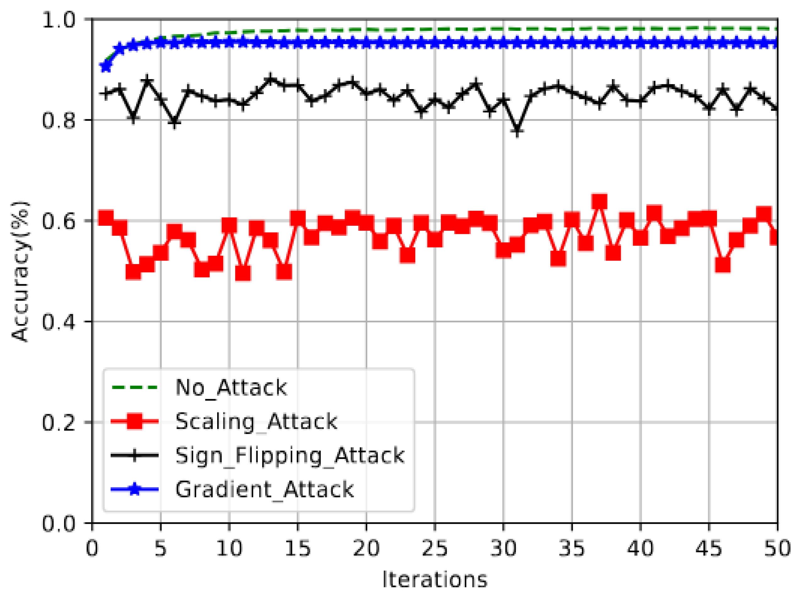- Blanchard, P.; El Mhamdi, E.M.; Guerraoui, R.; Stainer, J. Machine learning with adversaries: Byzantine tolerant gradient descent. In Proceedings of the 31st International Conference on Neural Information Processing Systems, Long Beach, CA, USA, 4–9 December 2017; Volume 30. [Google Scholar]