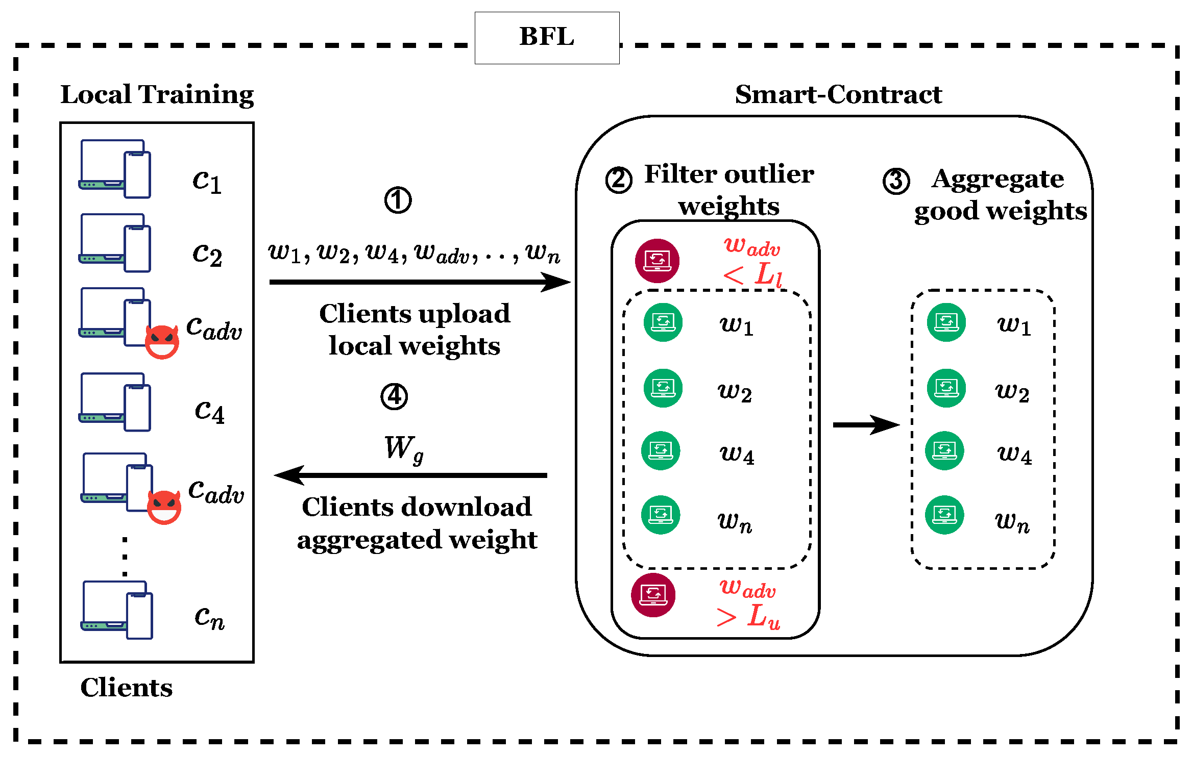 - Step 1: Each participating client performs its training and uploads local (malicious and non-malicious) model weights to the blockchain for aggregation (see lines 5–10 in Algorithm 1). It should be noted that the uploaded local weights come from both benign clients and malicious clients . They are added to the system as transactions.