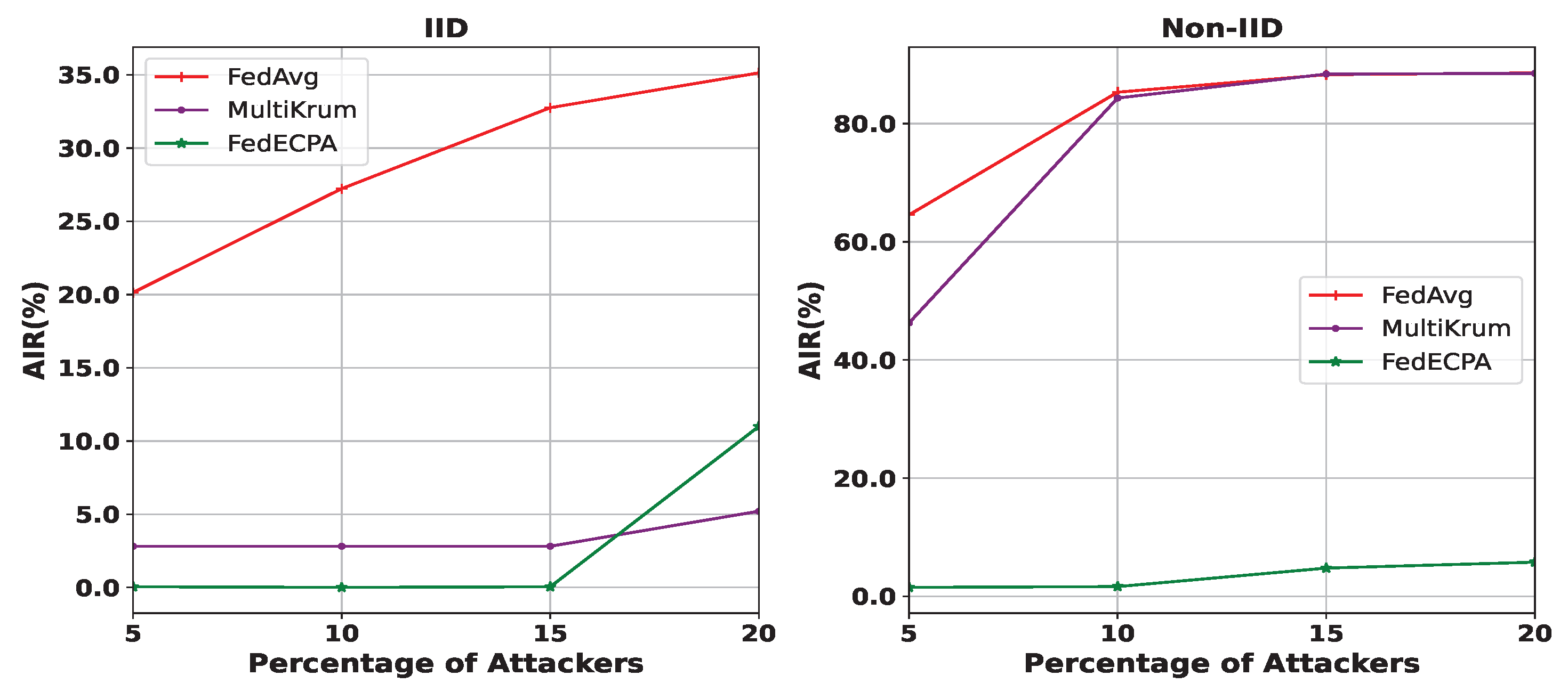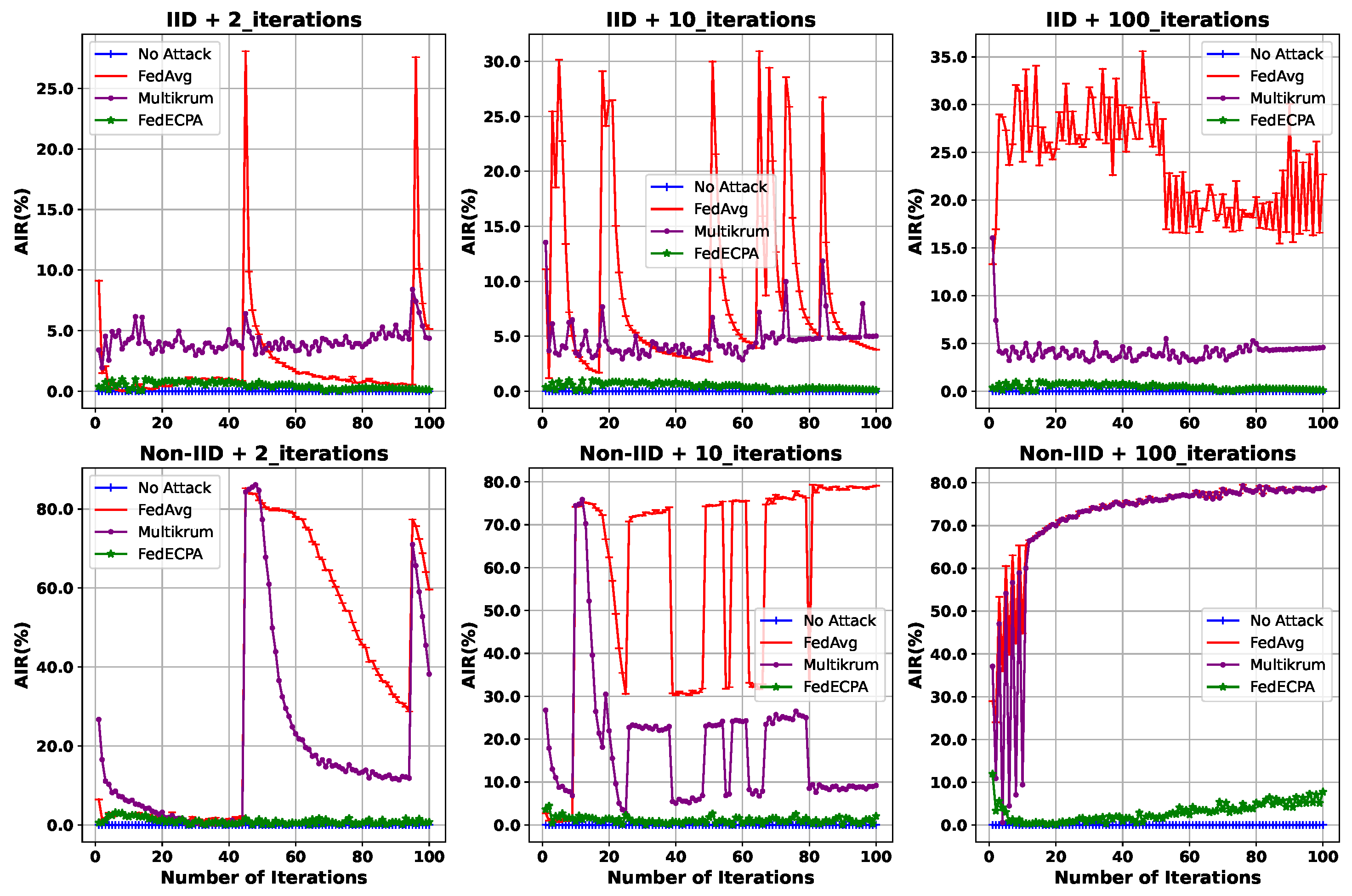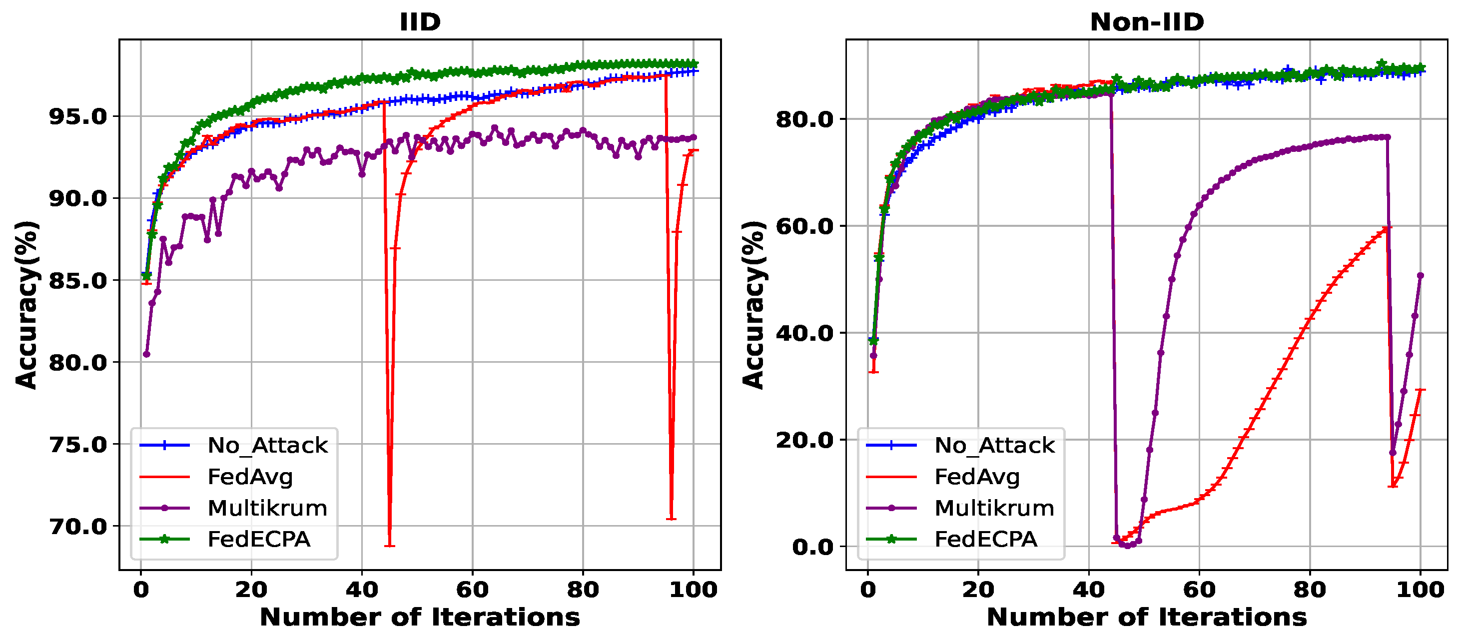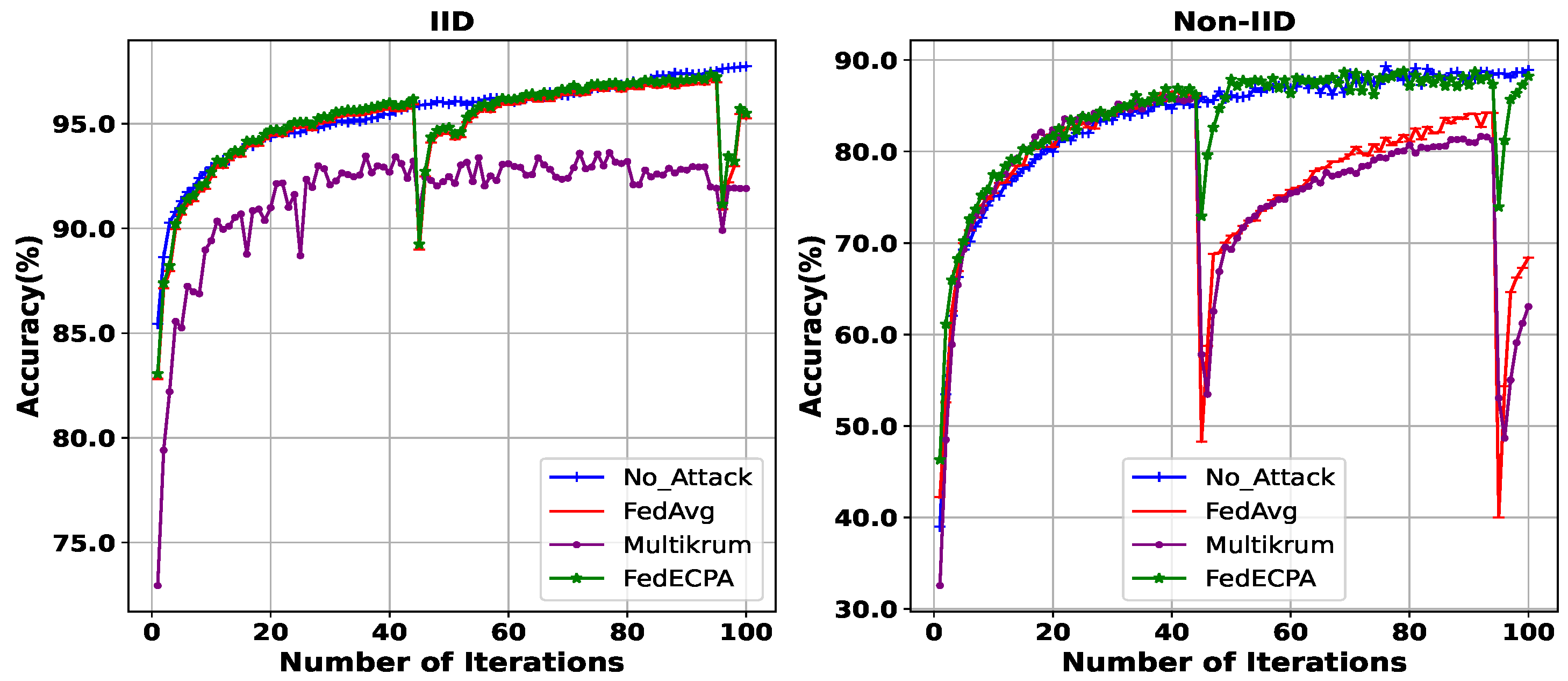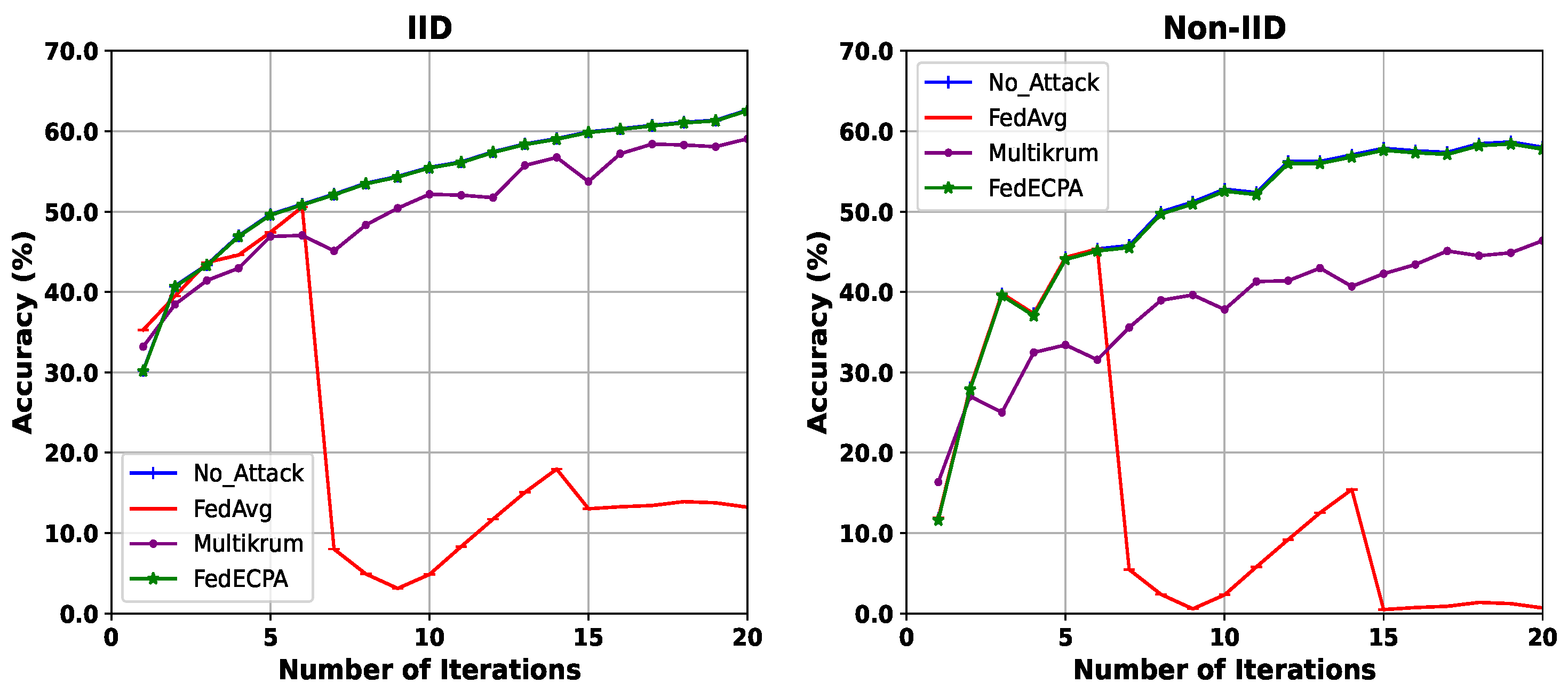 - Extensive experimental and comparative analyses are conducted in both IID and non-IID settings to demonstrate the impact of the model poisoning attack on BFL and the efficacy of the proposed defense mechanism. Results show that FedECPA, in most cases, outperforms Multikrum [27]—a traditionally robust FL aggregation algorithm that mitigates model poisoning attacks in most FL settings.