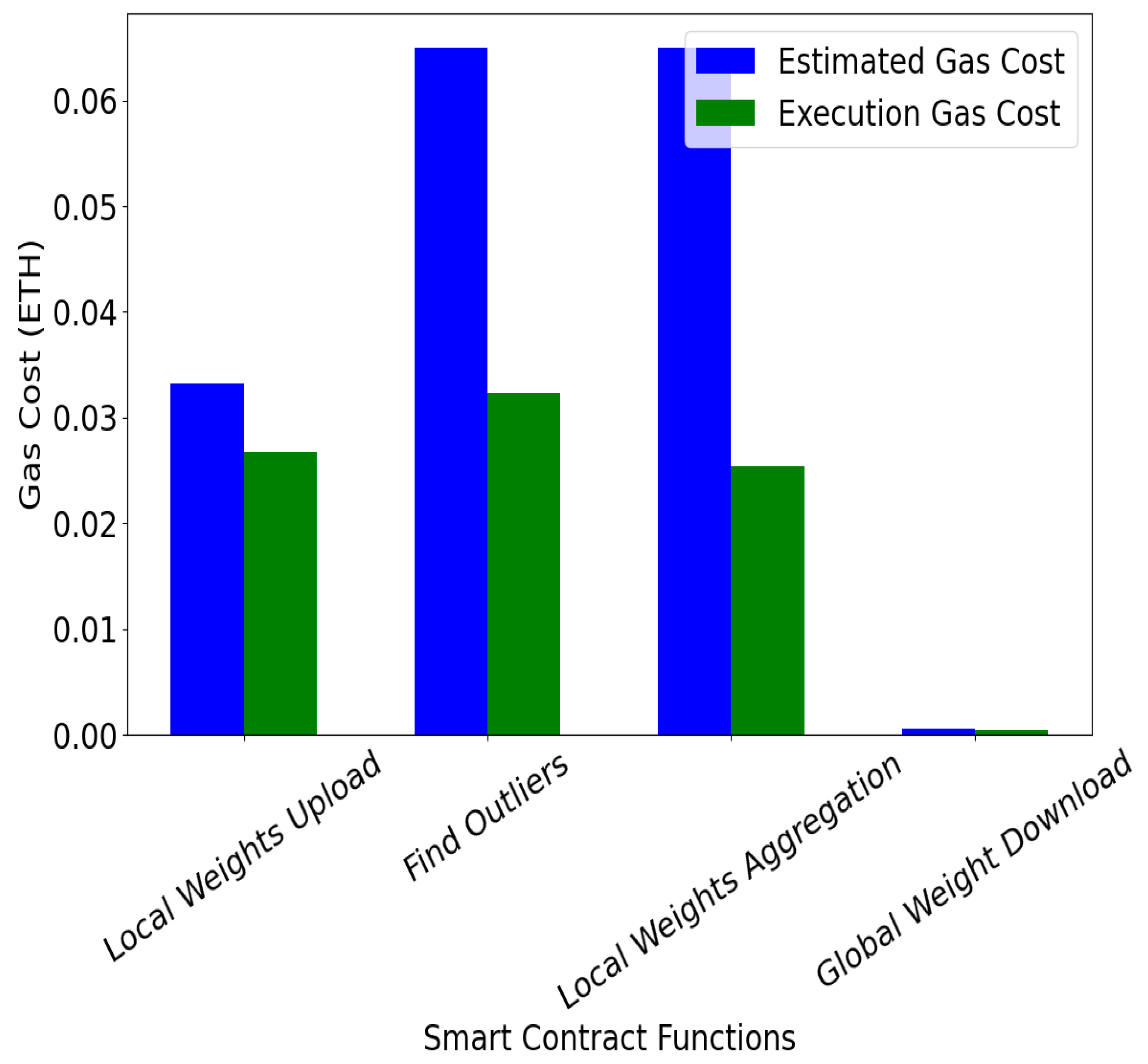 - : This function helps to filter out and isolate the outlier weights, , from being included in the aggregation process. To filter the outlier weights, the local model weights must be sorted. In our experiment, the weights were sorted before being uploaded to the blockchain because sorting on the blockchain requires a large amount of gas to be executed. With this function, only weights from non-malicious clients are considered for aggregation in each communication iteration.