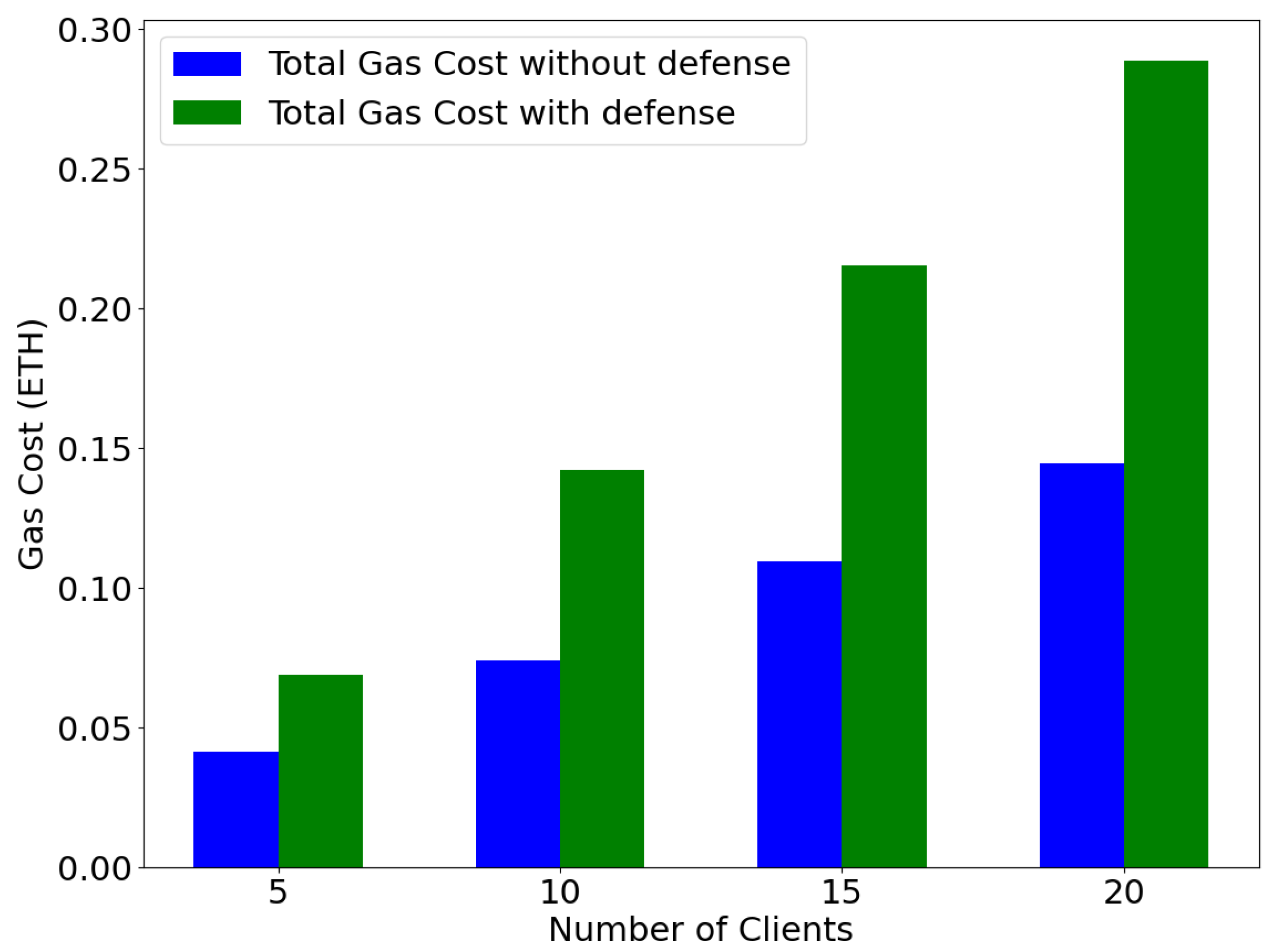 - Accuracy: It measures the efficacy of an ML model by estimating the ratio of accurate predictions of the model to the total number of predictions. In this work, we measure the BFL model accuracy without the attack, the BFL model accuracy with the attack, and the BFL model accuracy with the attack and the proposed defense. Note that accuracy here refers to test accuracy, i.e., the 10,000 testing samples that are assumed to be held aside for validation.