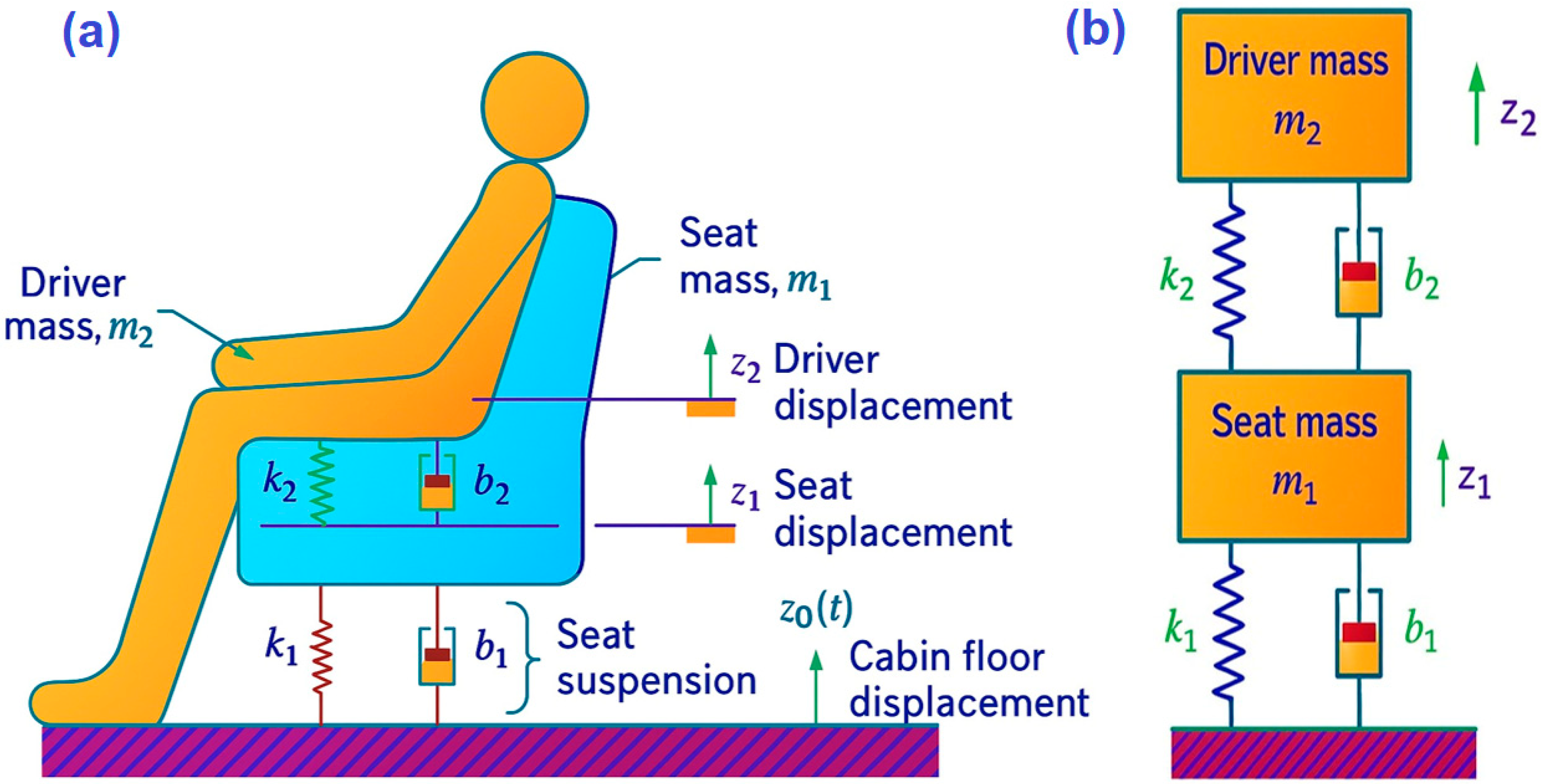 Figure 3b shows the concentrated mechanical model of the suspension-seat system. The seat’s total mass is represented by m