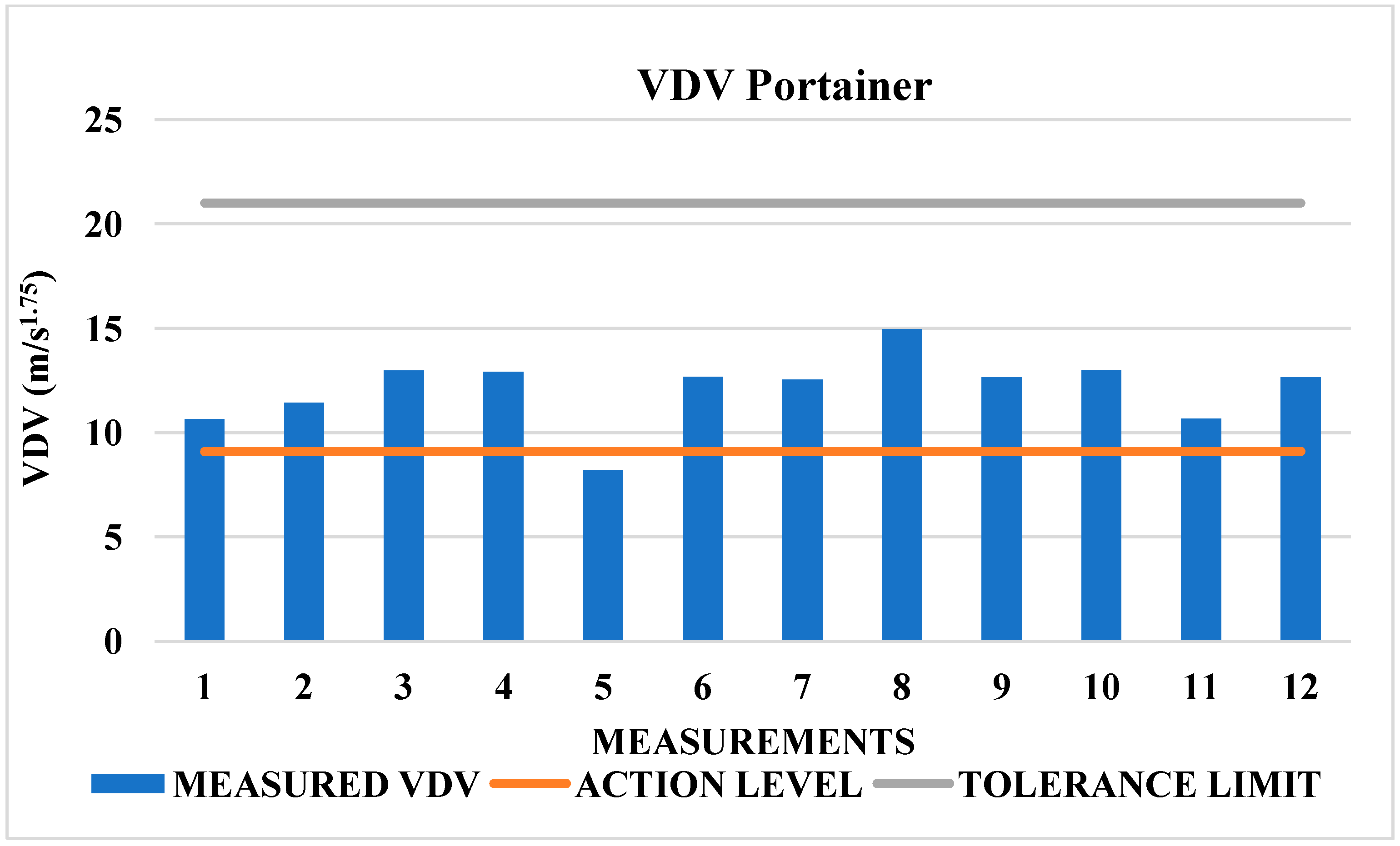 64], which evaluated WBV exposure in crane operators it was concluded that A(8) did not exceed action levels or tolerance limits. However, some VDV results reached the action level, while remaining below the tolerance limit. Therefore, it was concluded that vibration exposure is borderline and requires continuous monitoring of intensity and operator health for Portainer operators.