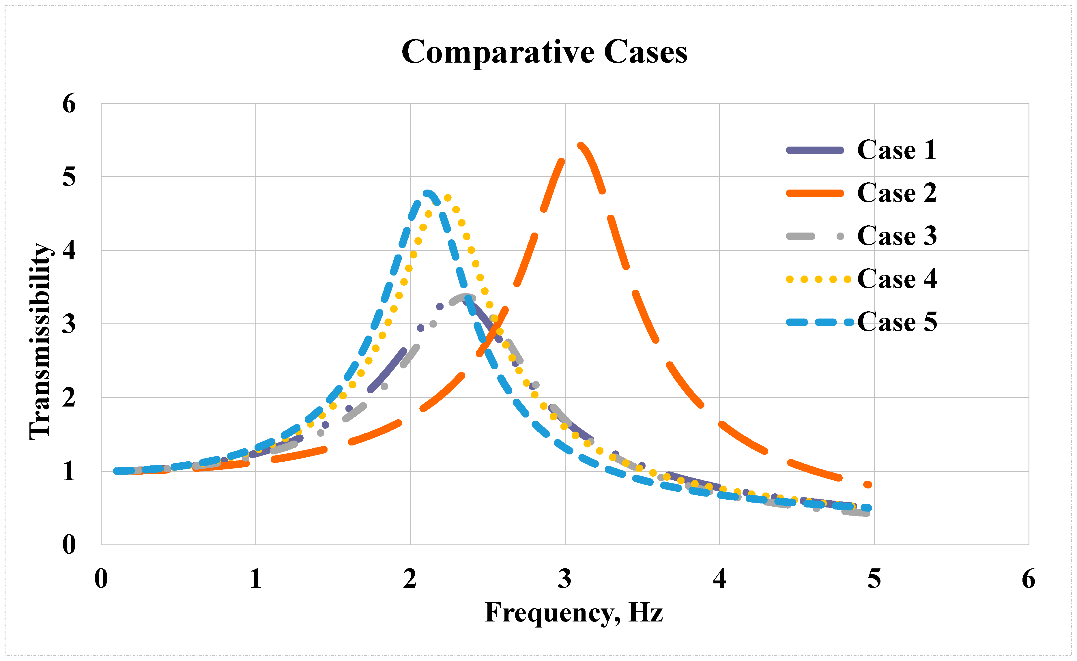 Finally, when comparing Cases 4 and 5, the transmissibility-frequency graphs display a strong similarity in the behavior of the suspension-seat system. This is attributed to the close proximity of parameter values in both cases.