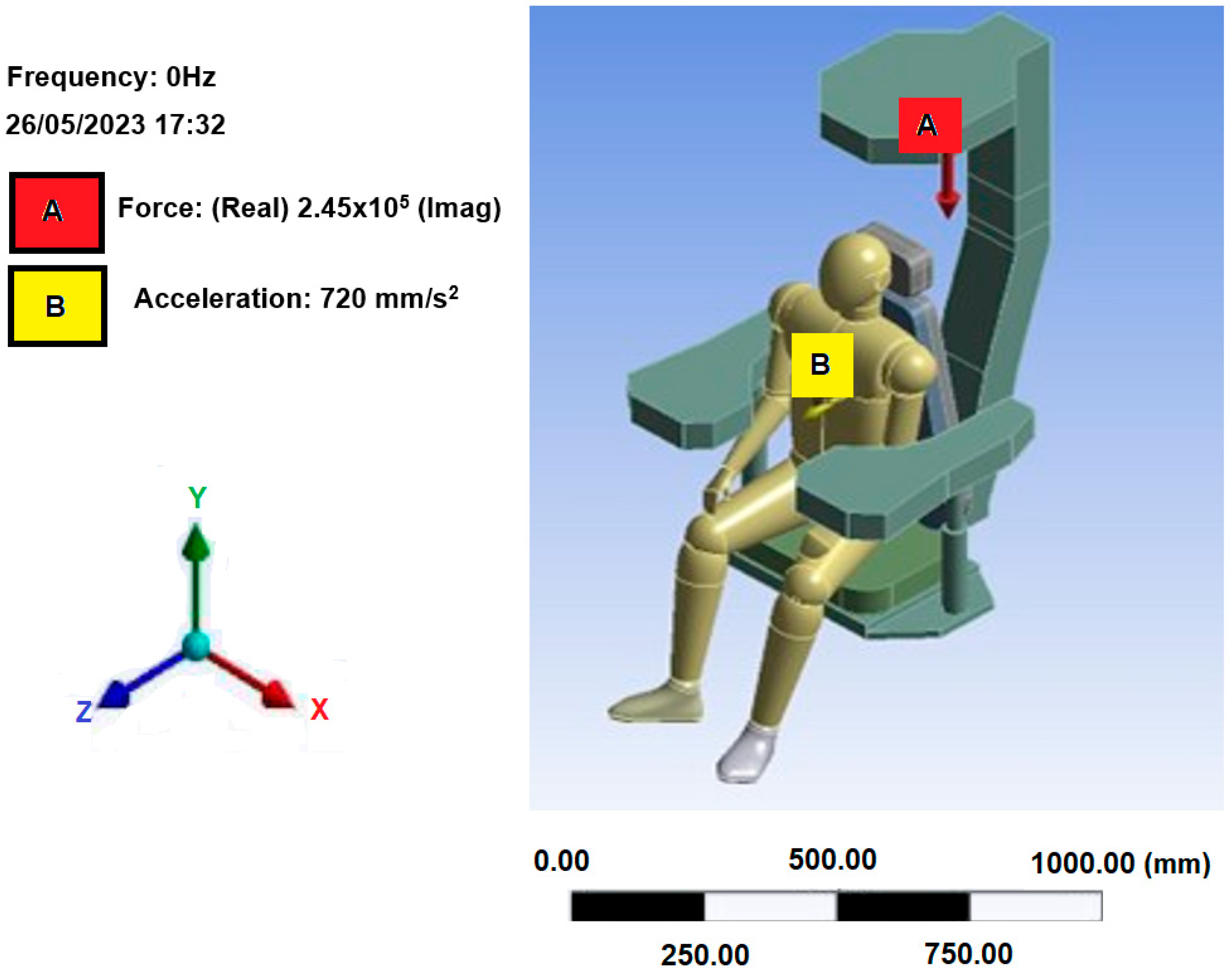 Additionally, three-dimensional simulations revealed vibration modes with significant activity along the X and Z axes, especially in critical body regions such as the head and lumbar area. The structural deformations observed in the seat, ranging from 0.34 to 0.36 mm, fall within the expected range and agree with findings in the literature [