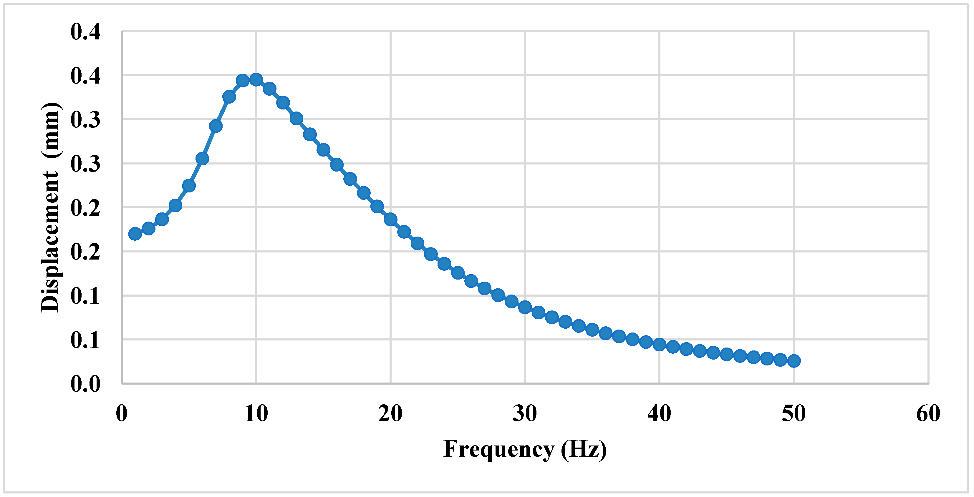 The displacement values gradually increase, reaching a maximum of 0.34497 mm at 10 Hz within the analyzed frequency range. Beyond 10 Hz, the displacement values progressively decrease, as shown in