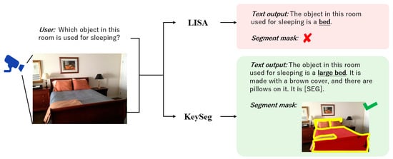 Figure 1 illustrates this problem. For the query ‘Which object in this room is used for sleeping?’, LISA [] generates a reasonable textual response of ‘The object in this room used for sleeping is a bed’ but fails to produce a segmentation mask for the target object. In contrast, the proposed keyword-conditioned image segmentation model (KeySeg) generates both a coherent textual response and an accurate segmentation mask for the bed, demonstrating more effective task alignment between language and vision.